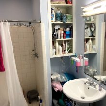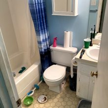 14. Hang clean hand towels in bathrooms. Store extra beauty and toiletries under the counter and pull shower curtains ¾ closed.