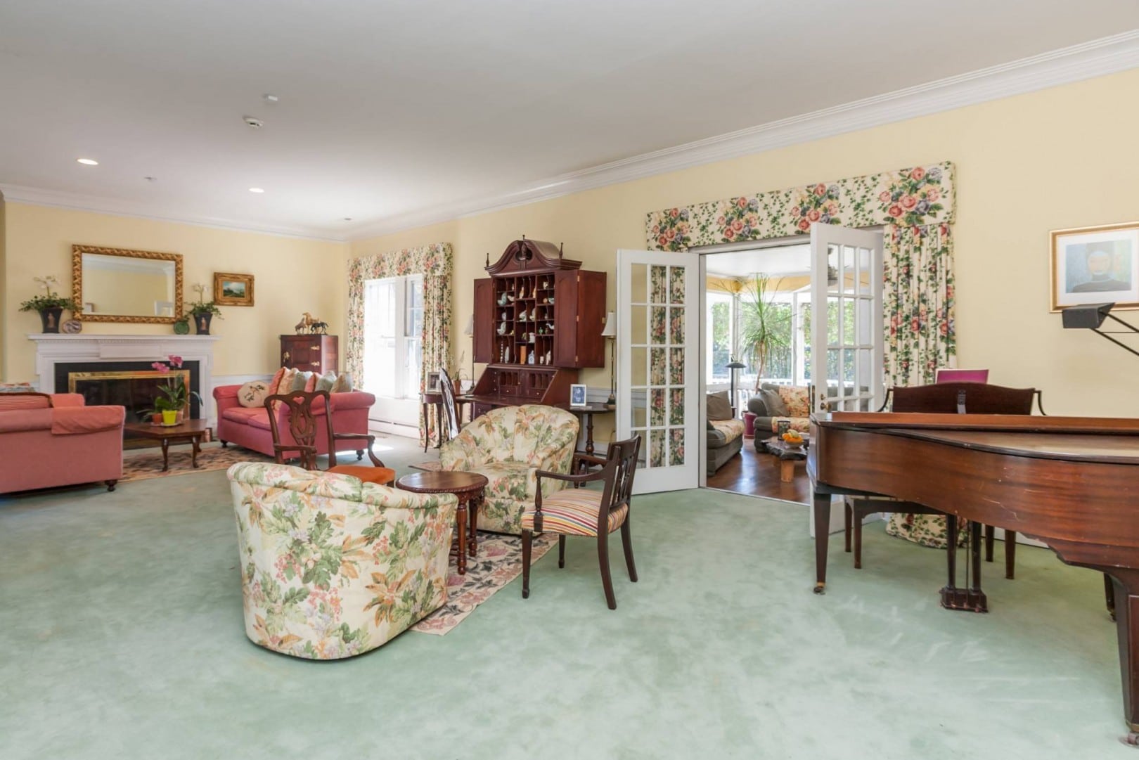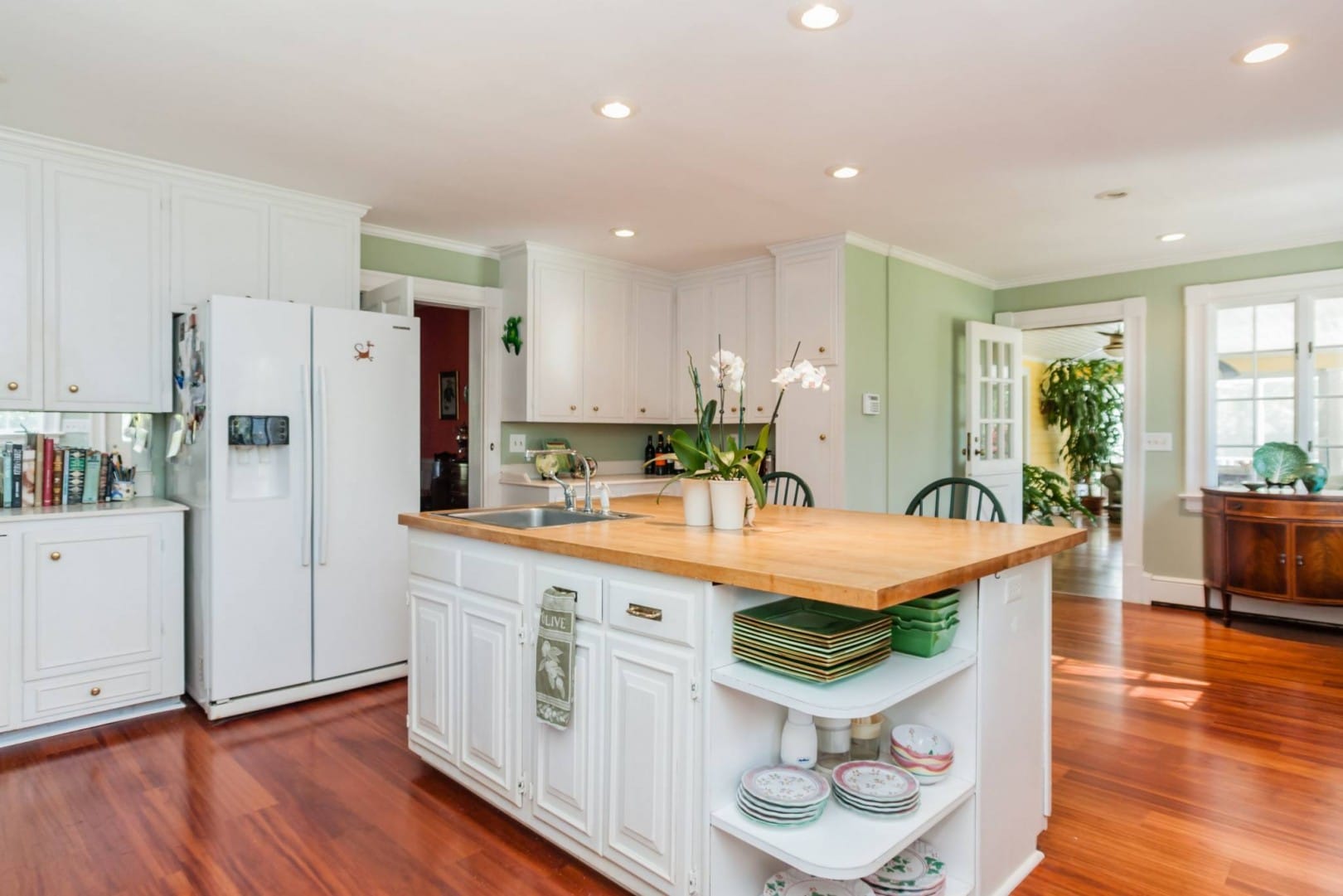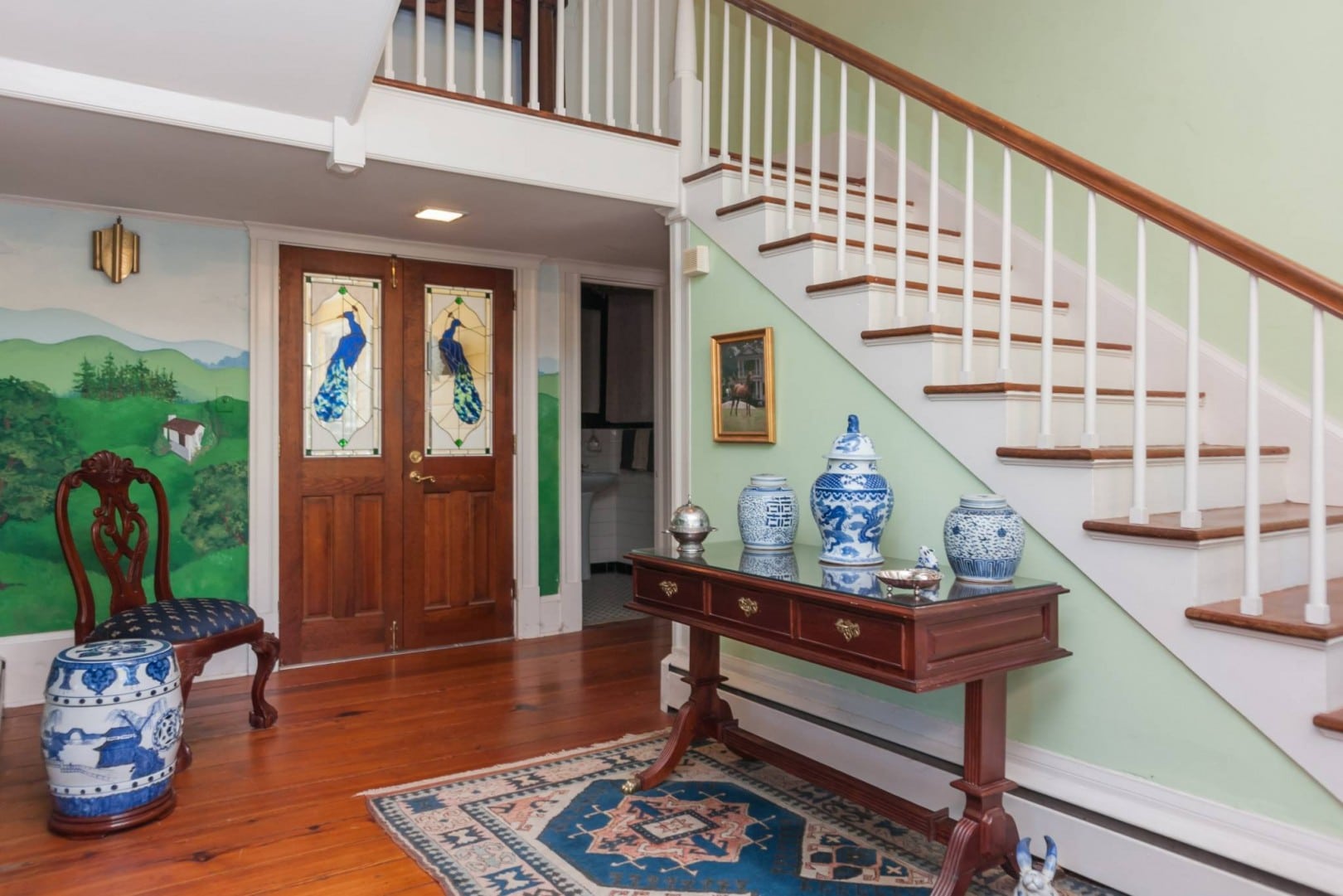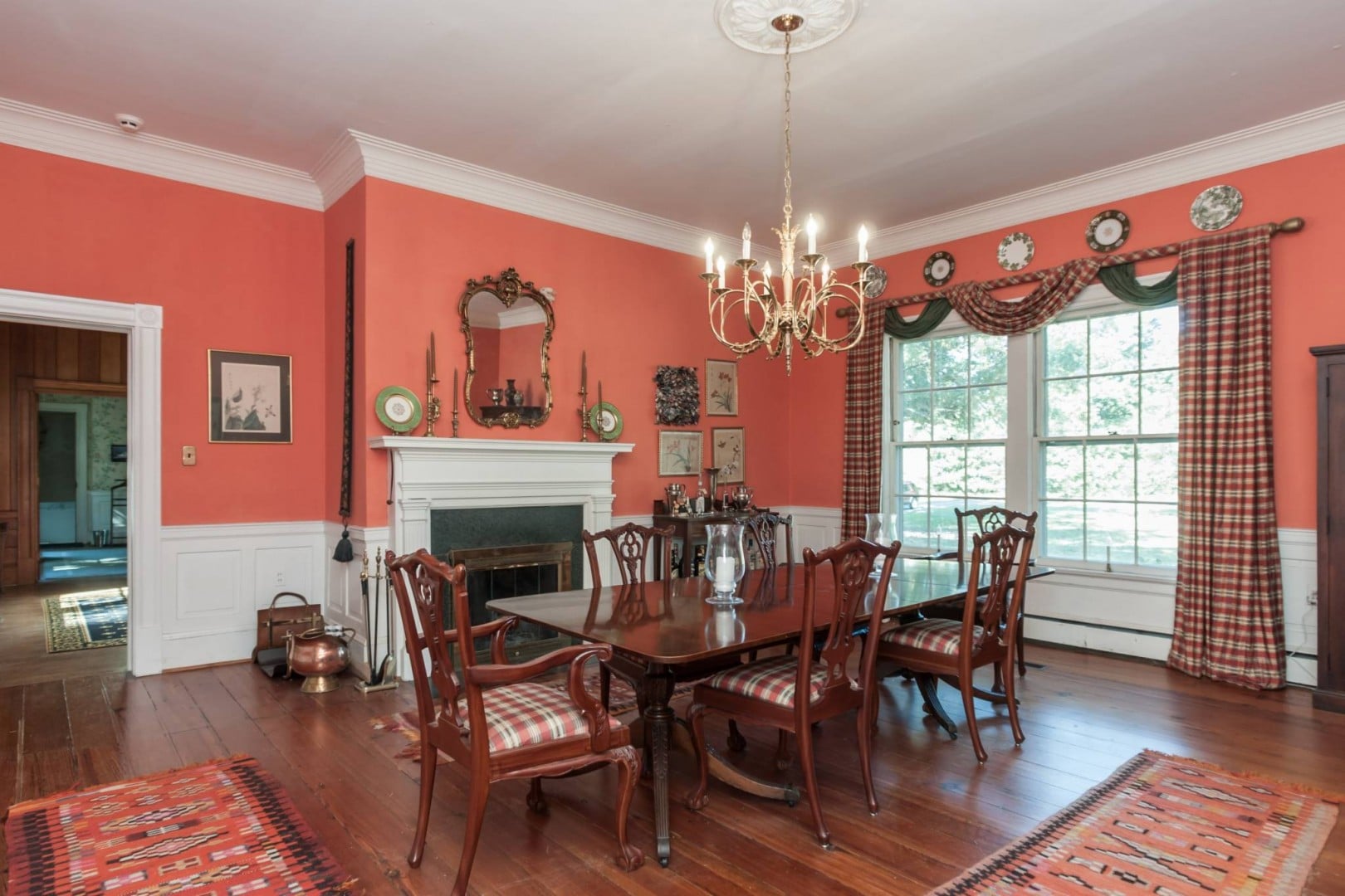 As notable as it is, Pine Hall is simply a fantastic place to live. The double doors open from the entry porch to a wide foyer. The historical detailing is evident immediately and your guests will pause to absorb the impact of the space. There is a gorgeous mural of the original property flanking a set of leaded glass doors depicting a pair of the past beloved family members. Through these french doors, and located at the rear of the home are a wide open sunroom, that leads to a wrap-around porch. The sunroom is also connected to the open kitchen and breakfast room. The kitchen is completely modern and there is more than enough counter and cabinet space. There is a screened porch directly off of the kitchen that leads to the garden and backyard.