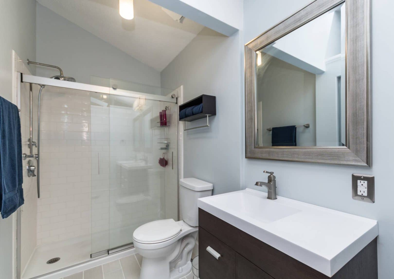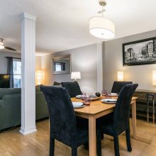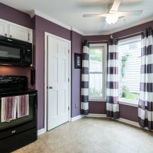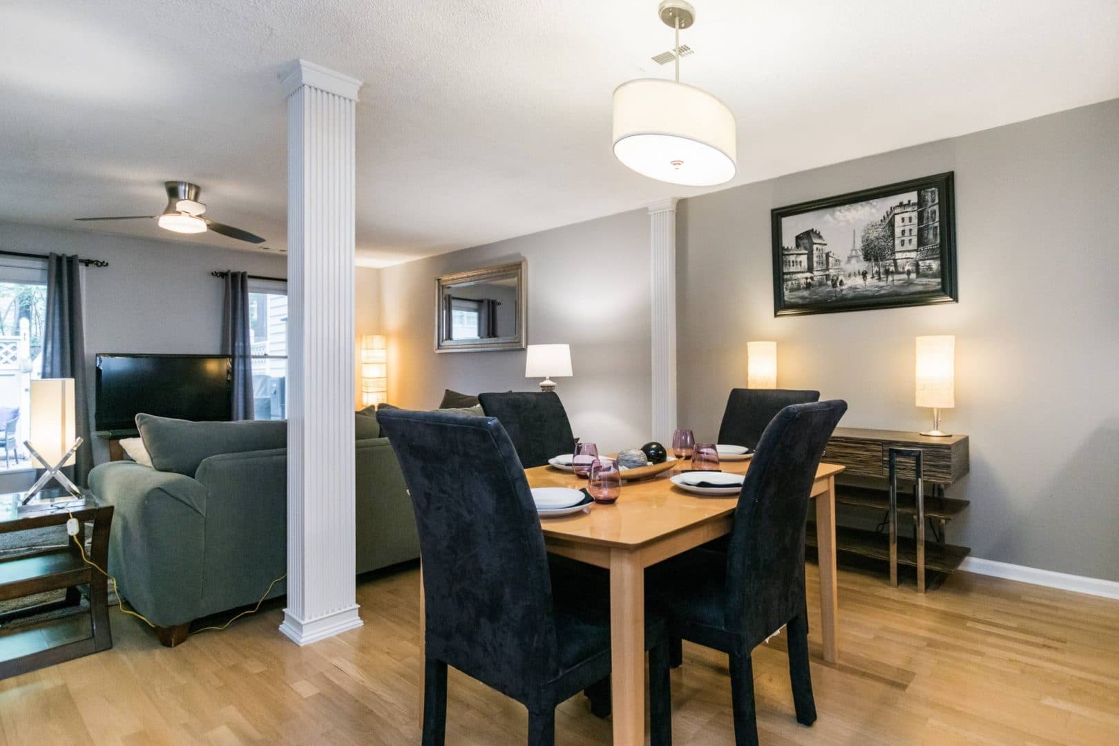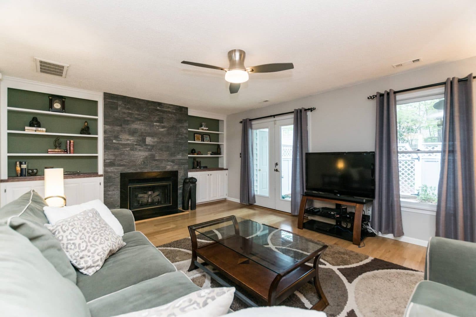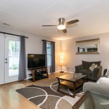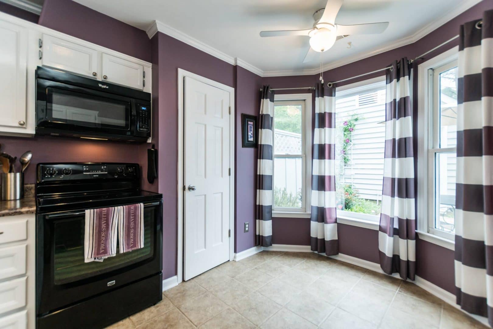 Upon entry into the home, the modern upgrades are evident. The kitchen is to the right and offers an intimate cooking experience with a bay window breakfast nook as well as a pass-thru bar connection to the other living spaces. The dining room is distinct yet open, with attractive column detailing and plenty of space for any type of dining arrangement. The main living space is bright and airy, and features a gas fireplace flanked by built-in shelves as well as French doors to the fenced rear yard.