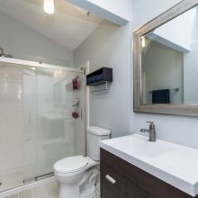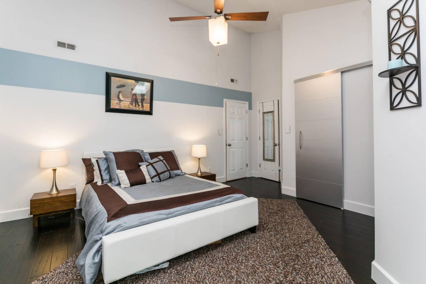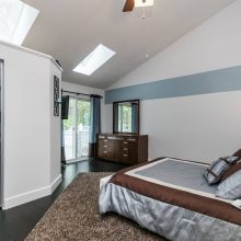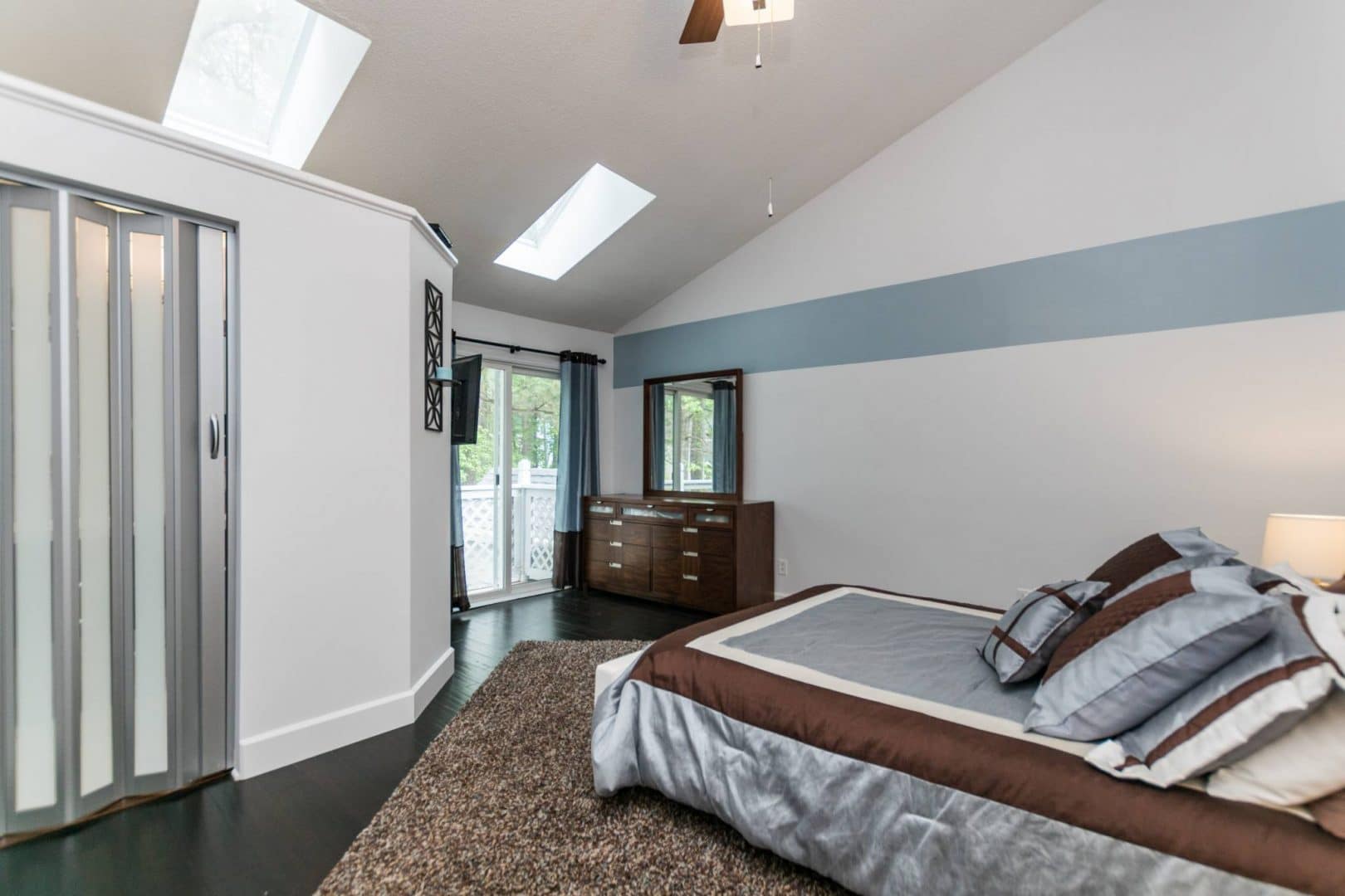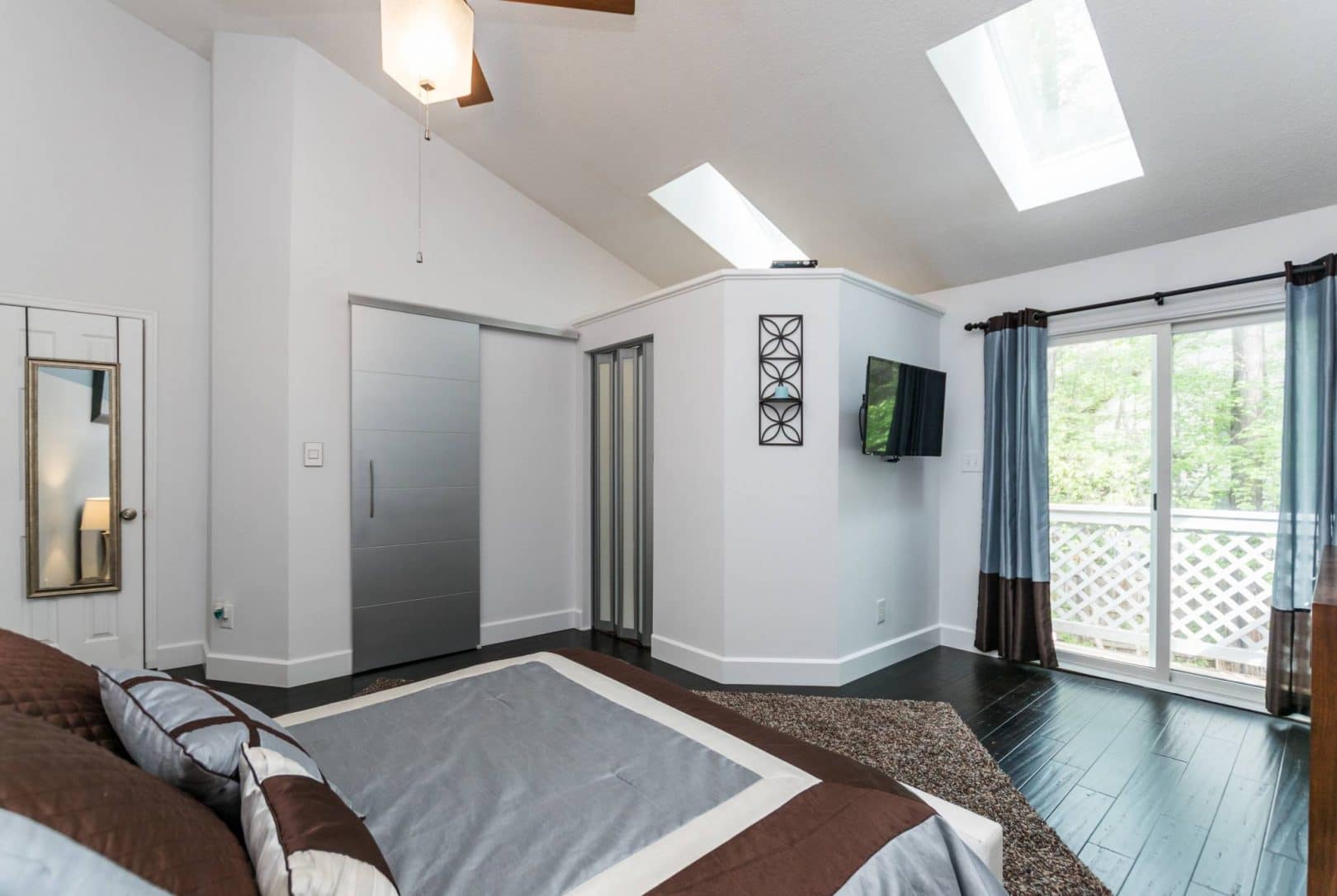 Upstairs, the layout has two master suites and the laundry room. The larger suite has a soaring vaulted ceiling with two skylights that showcase the bamboo flooring. There is a private balcony and a sliding barn door hides the large walk-in closet. Modern metal bifold doors open to a spa-like bath. Upgrades to the bath include modern casework and a glassed shower with a rain showerhead.