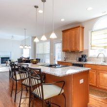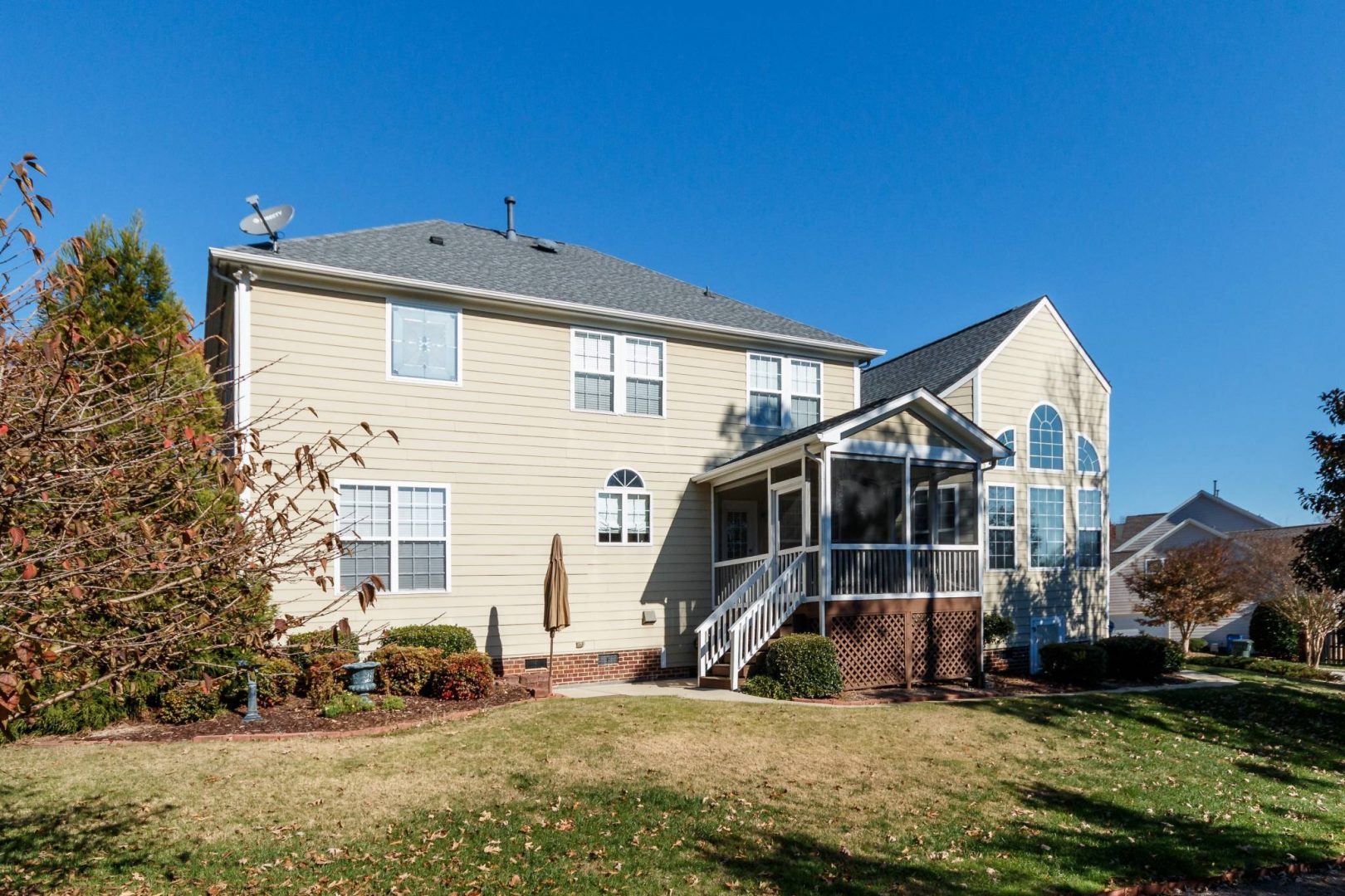 The rear of the home showcases a two-story family room, kitchen and breakfast nook. The wall of south facing windows and glass doors leading to the screened porch provide great light. A gas fireplace and built-in casework will provide an elegant backdrop to any type of furniture. As a bonus, the family room is wired for surround sound. The open kitchen is great for family gatherings, and has solid oak cabinets with tile backsplash, stainless appliances, acres of granite prep space and a sizable pantry. The laundry room doubles as a mud room as it connects the garage to the main living area.