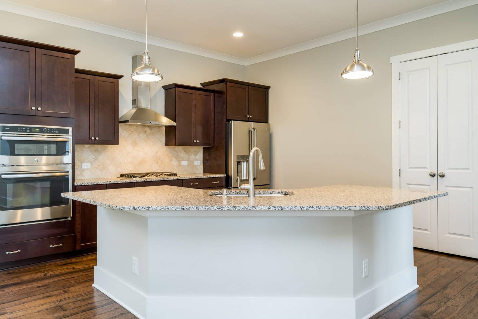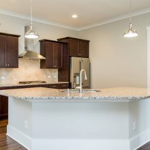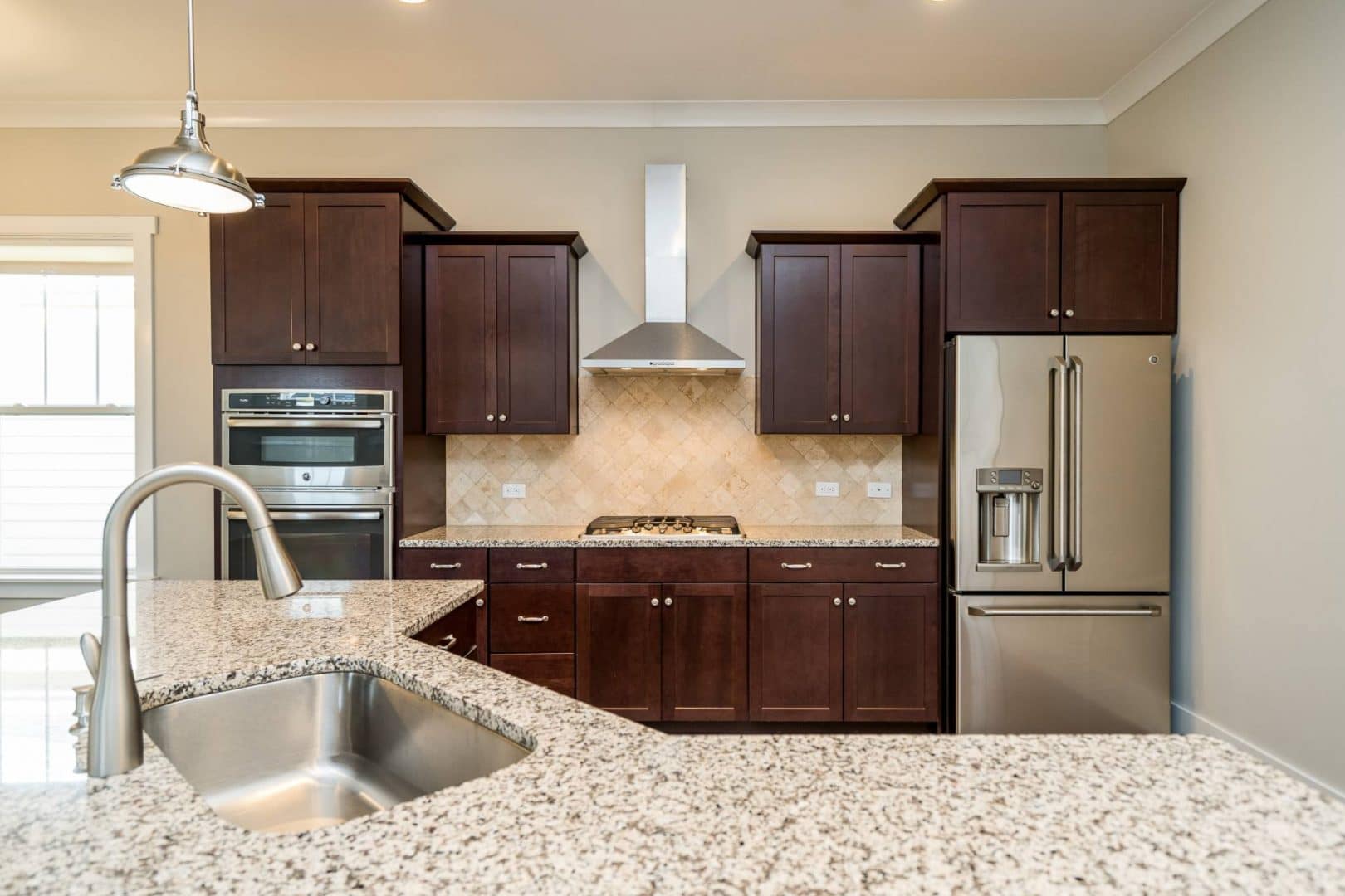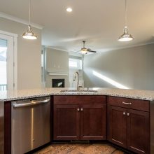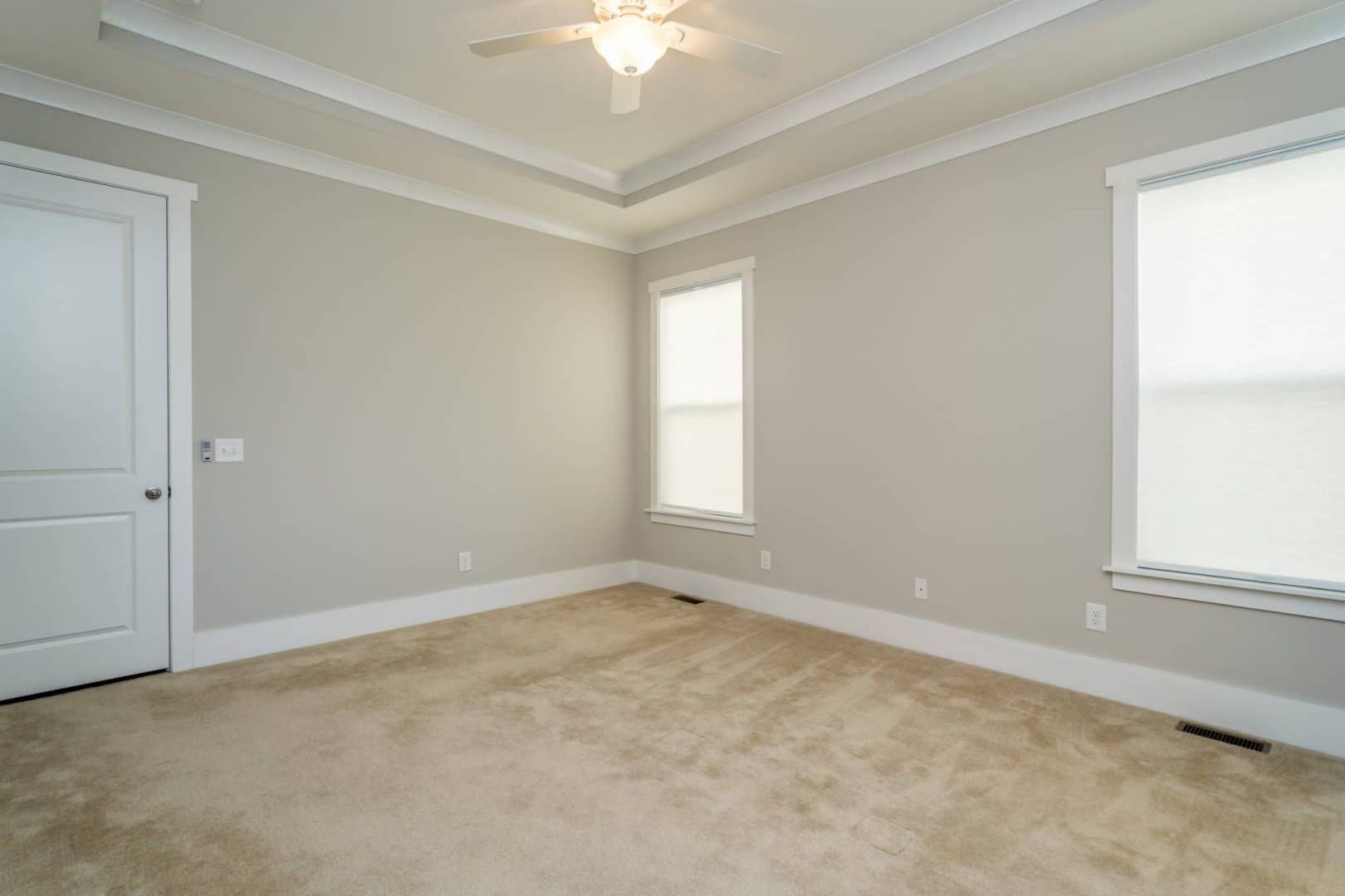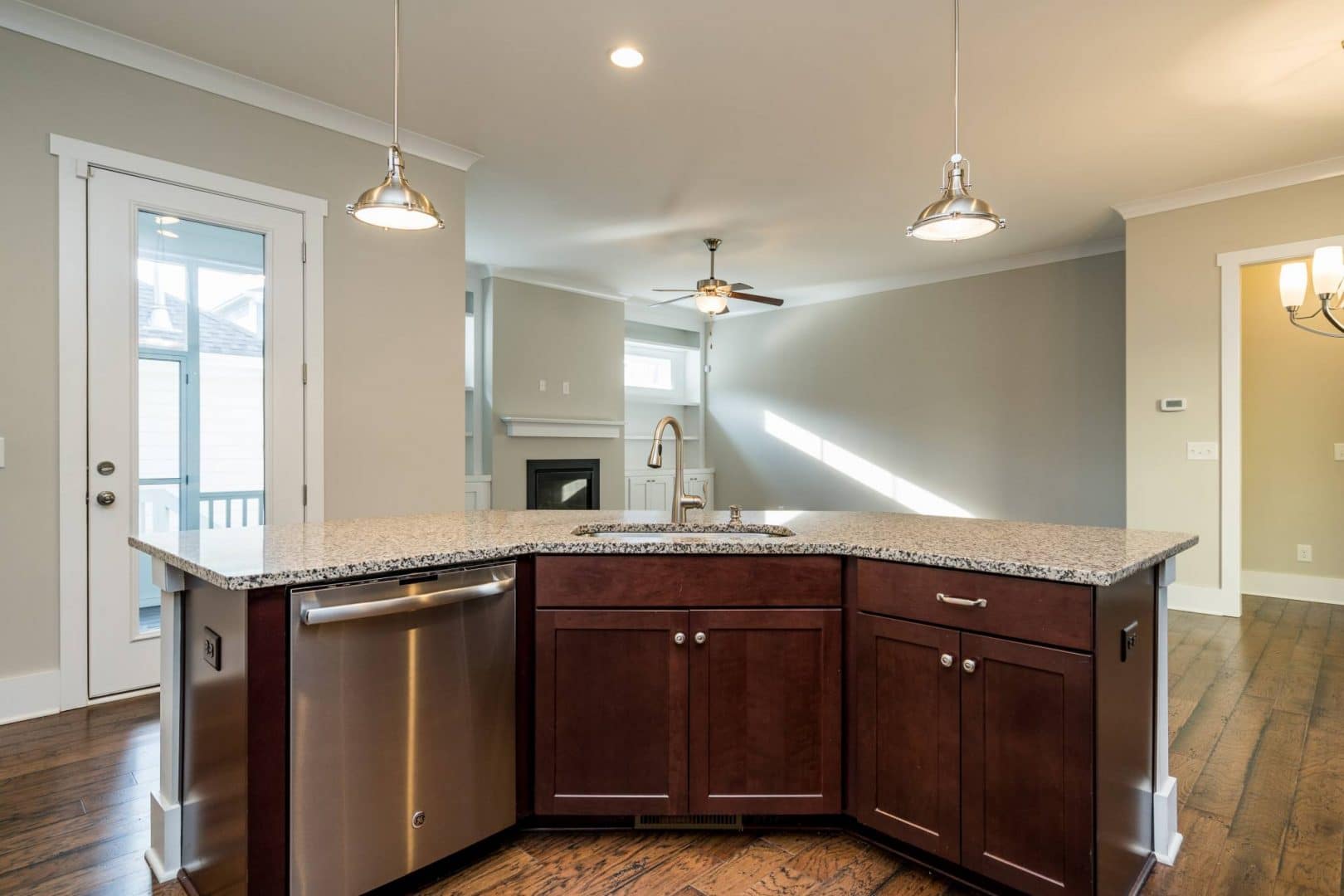 Measuring at just over 2100 square feet, the home offers a fantastic open layout and features a master suite on the main living level. This section of homes is built with alley-load garages, so that nothing detracts from the inviting curb appeal of your home. You will be proud to welcome your guests onto the large front porch and into your new home. There is a large foyer upon entering, along with a powder bathroom and coat closet. A wide hallway beckons past a large screened side porch – the windows along the hallway provide beautiful natural light. A vestibule off of this hall connects the large laundry room – replete with casework and a granite sink – and the master suite. The master suite is surprisingly large, and features an attractive trey ceiling. The master bath is decadent as well with double sinks, a large soaking tub and glassed shower – the high ceilings really make this space feel special. There is custom casework in the large walk-in closet.