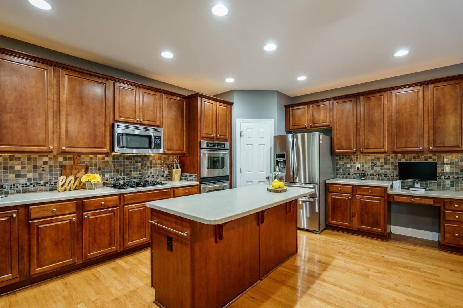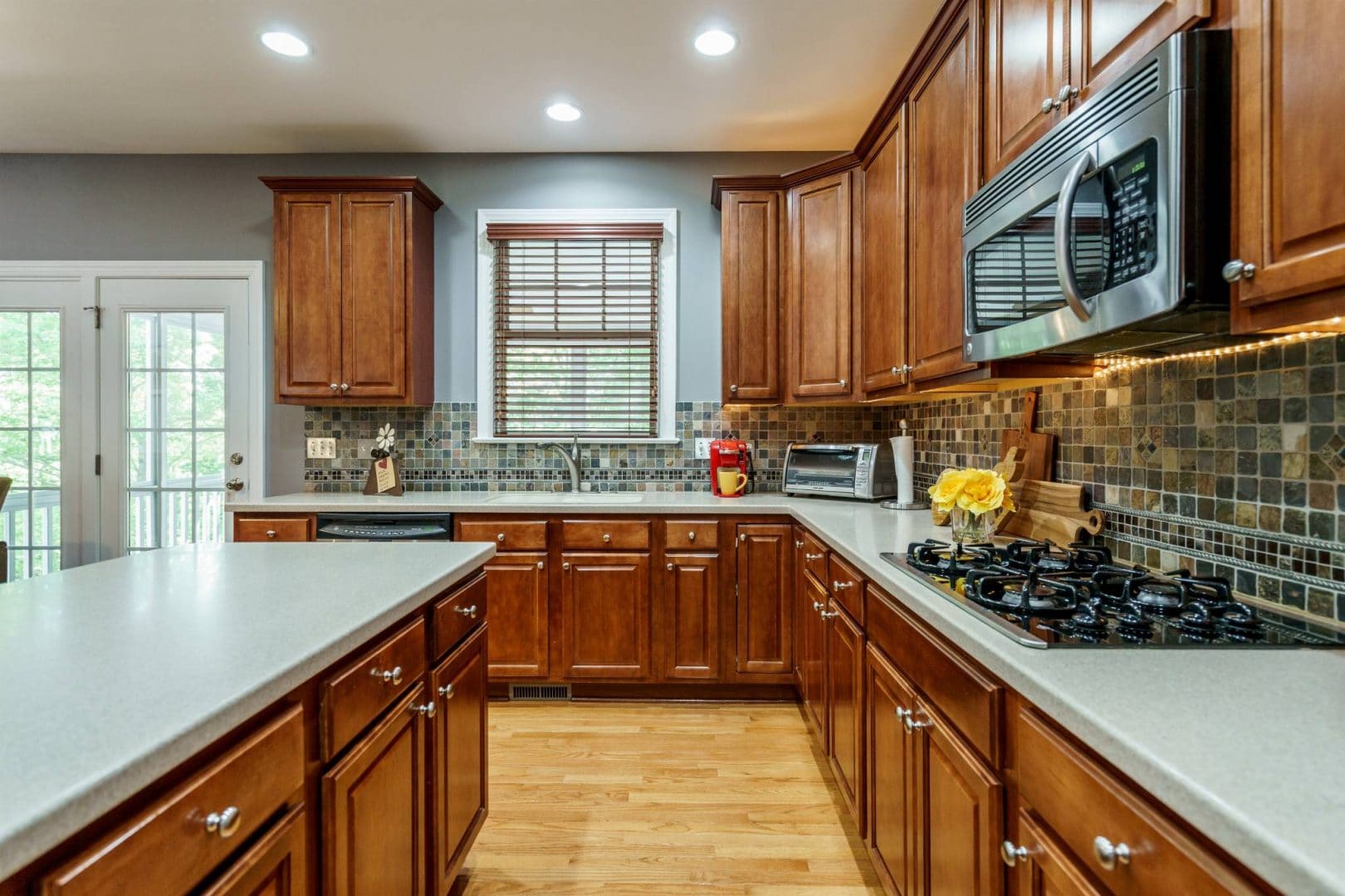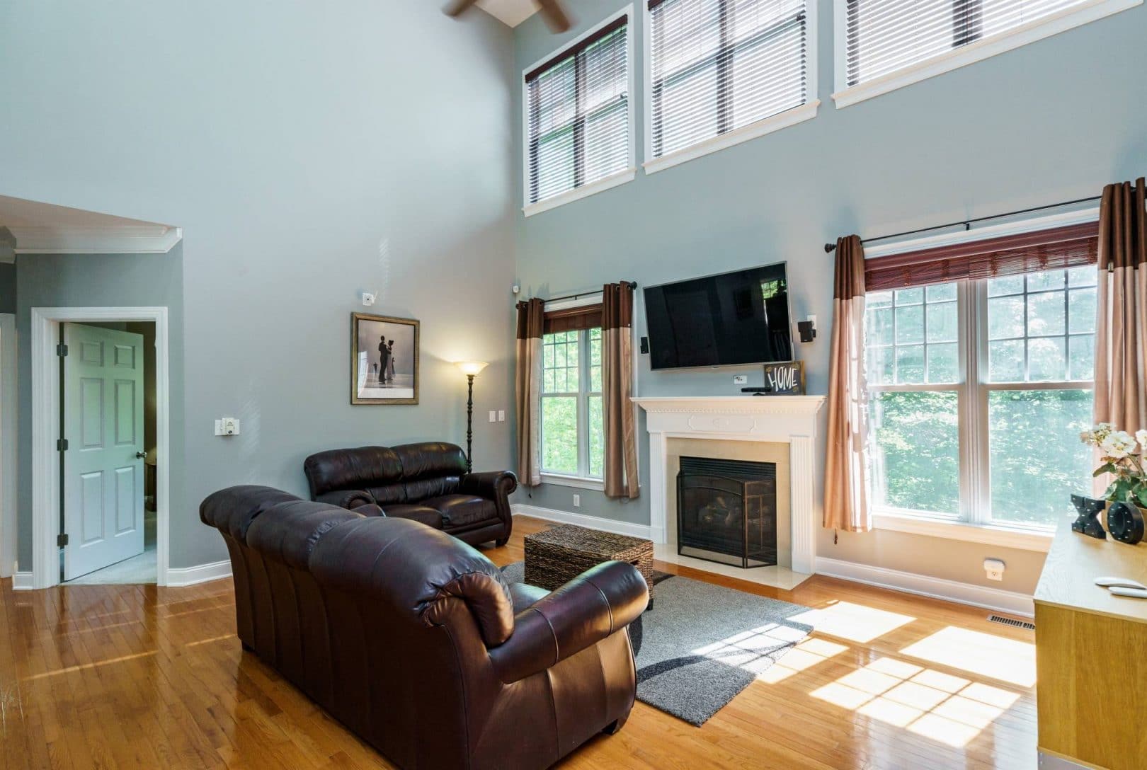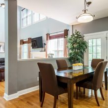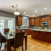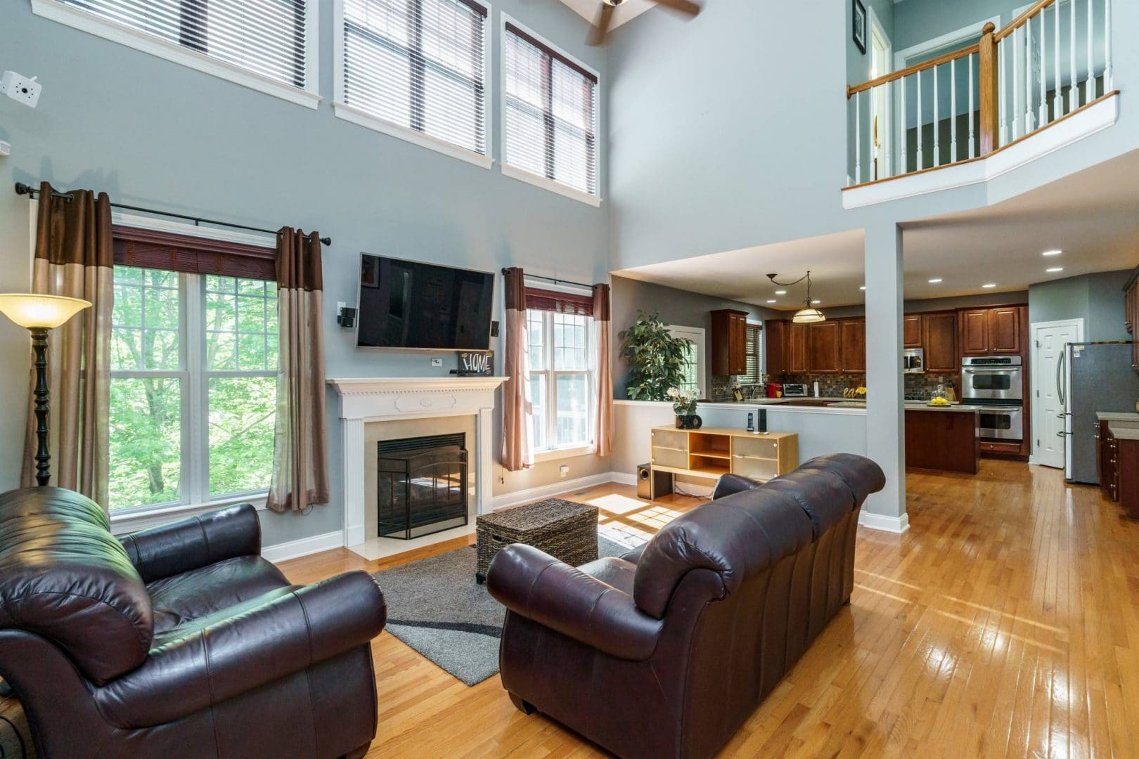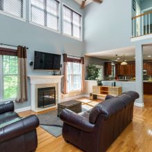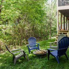 The rear of the home features a two-story great room open to the kitchen and breakfast nook. Morning sun streams through the wall of east-facing windows and the space is anchored by a warm gas fireplace. There is a private first floor guest suite in the home perfect for long or short-term visitors. The kitchen and breakfast nook are open yet distinct and provide plenty of opportunity for entertaining, or intimate family dinners. The kitchen features more than enough honey-maple casework, stainless appliances including a double wall oven and gas cooktop, stone backsplash, and acres of counter prep space. The breakfast nook opens onto a beautiful screened porch – the space feels like a tree house.