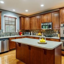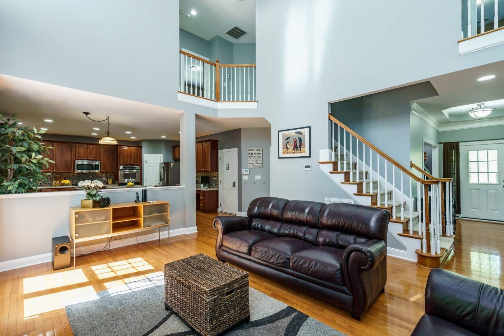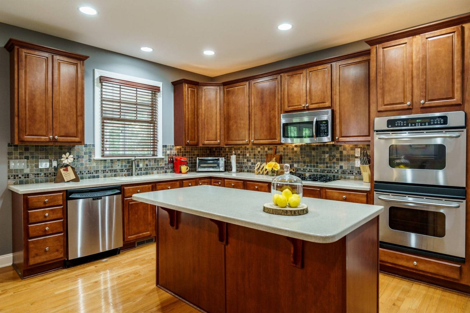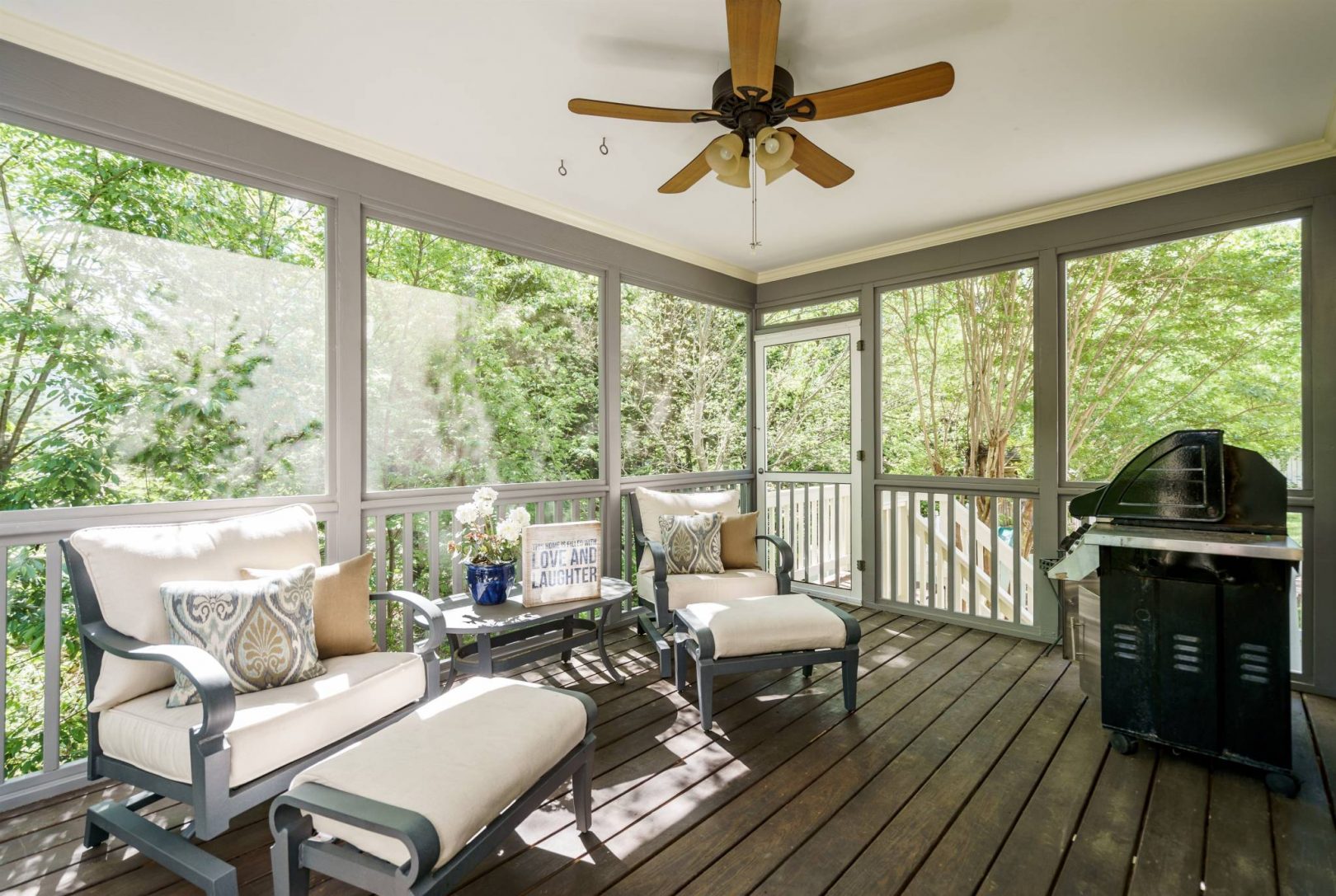 The rear of the home features a two-story great room open to the kitchen and breakfast nook. Morning sun streams through the wall of east-facing windows and the space is anchored by a warm gas fireplace. There is a private first floor guest suite in the home perfect for long or short-term visitors. The kitchen and breakfast nook are open yet distinct and provide plenty of opportunity for entertaining, or intimate family dinners. The kitchen features more than enough honey-maple casework, stainless appliances including a double wall oven and gas cooktop, stone backsplash, and acres of counter prep space. The breakfast nook opens onto a beautiful screened porch – the space feels like a tree house.