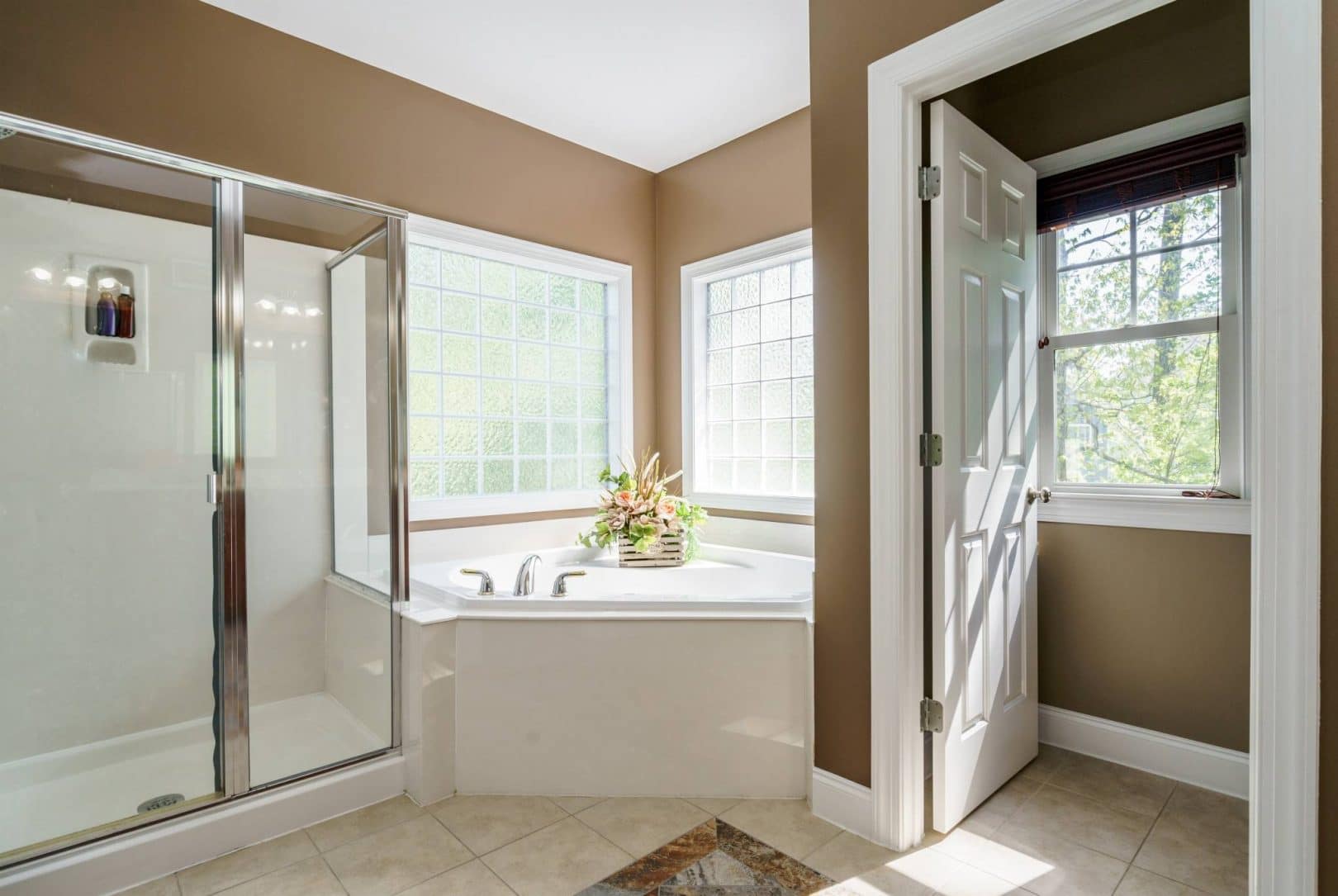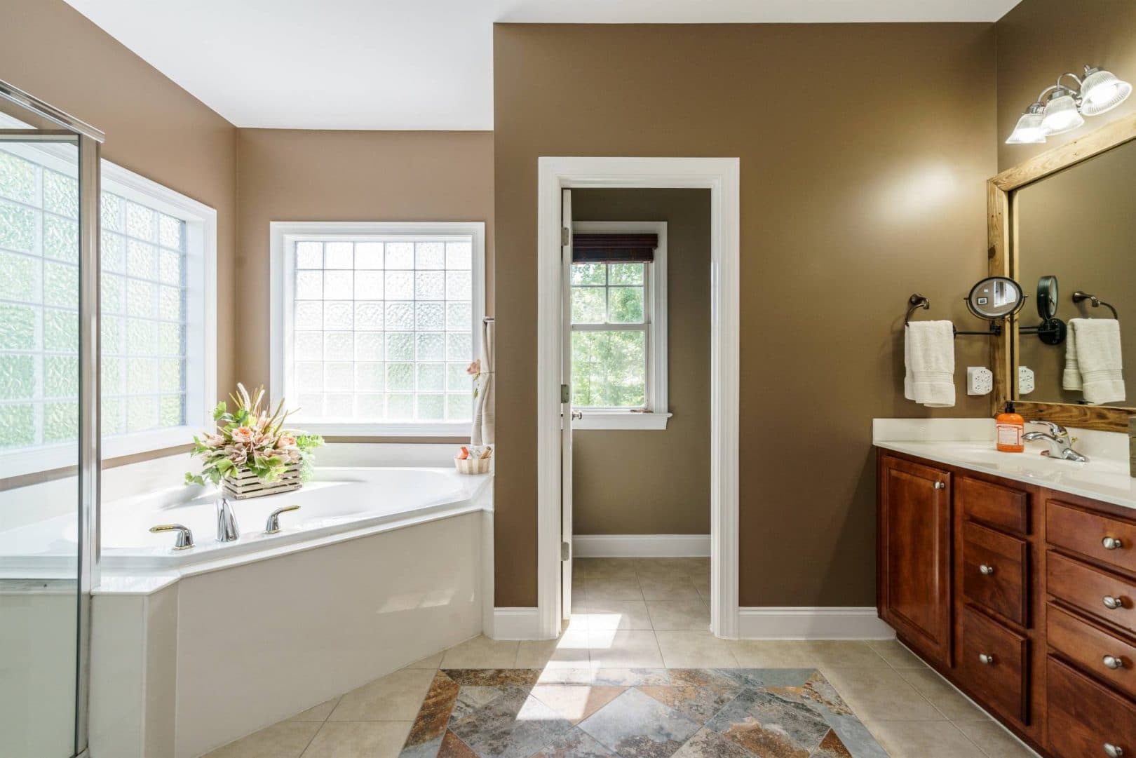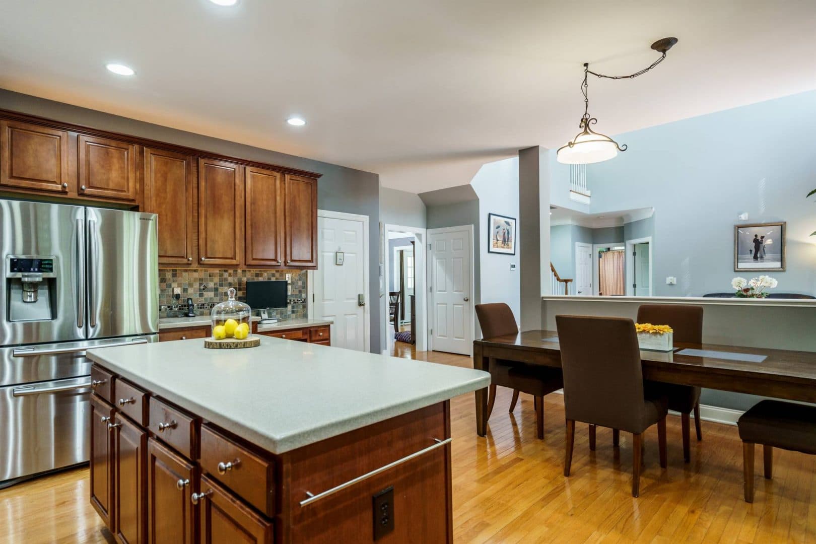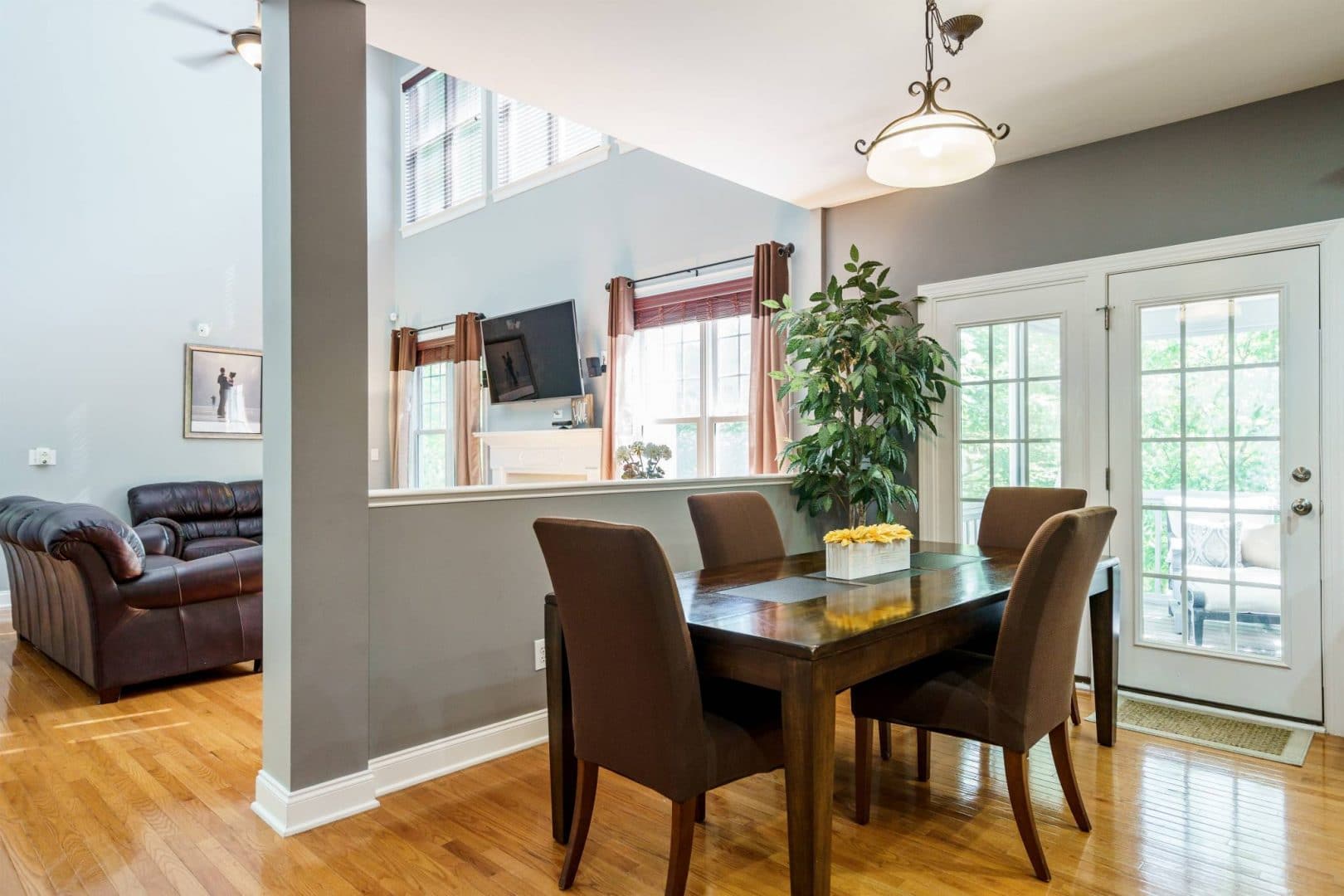 The rear of the home features a two-story great room open to the kitchen and breakfast nook. Morning sun streams through the wall of east-facing windows and the space is anchored by a warm gas fireplace. There is a private first floor guest suite in the home perfect for long or short-term visitors. The kitchen and breakfast nook are open yet distinct and provide plenty of opportunity for entertaining, or intimate family dinners. The kitchen features more than enough honey-maple casework, stainless appliances including a double wall oven and gas cooktop, stone backsplash, and acres of counter prep space. The breakfast nook opens onto a beautiful screened porch – the space feels like a tree house.