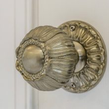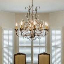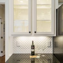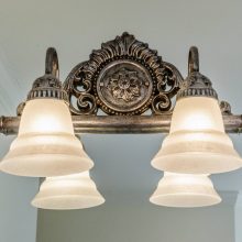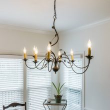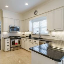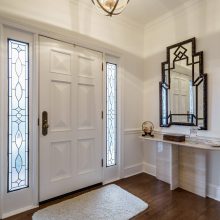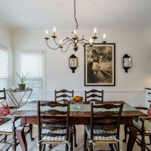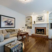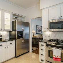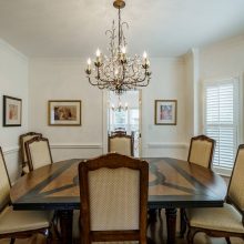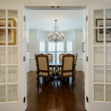 As you enter the house, you’ll notice the beautifully detailed front door, fabulous pendant light, gleaming hardwood floors, and the decorative columns that separate the open living room from the entry. Connecting to this space is a dining room that seats 10, which has a big bay window and a whimsical crystal chandelier that all will admire.