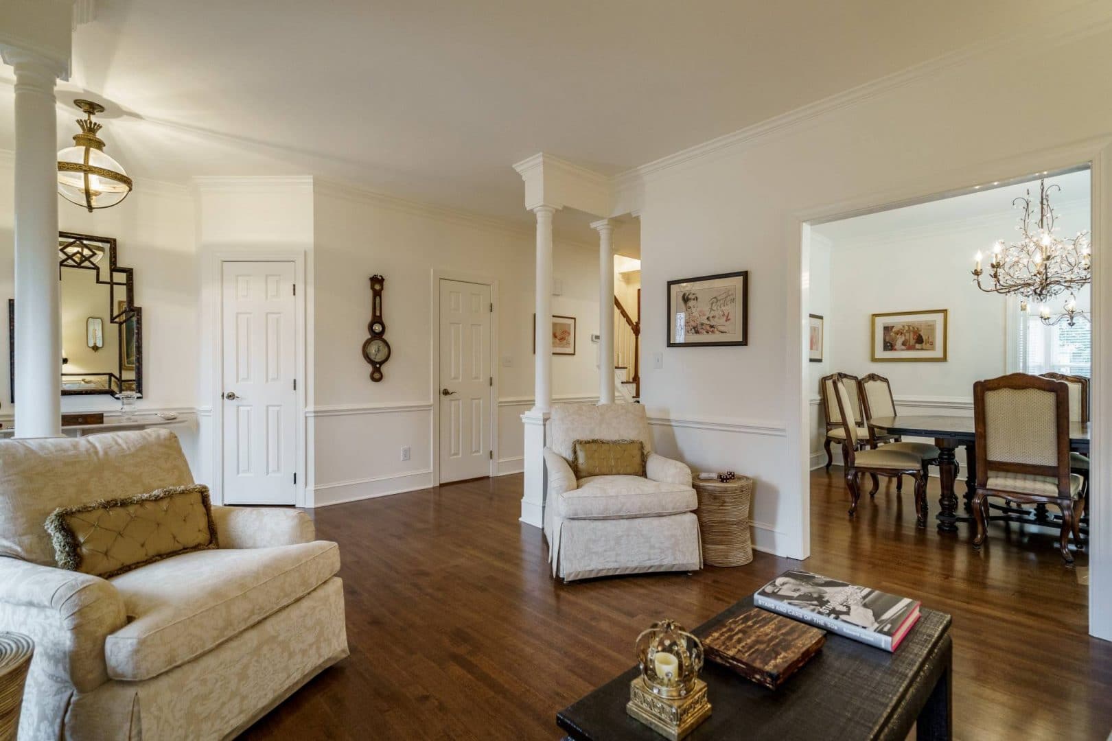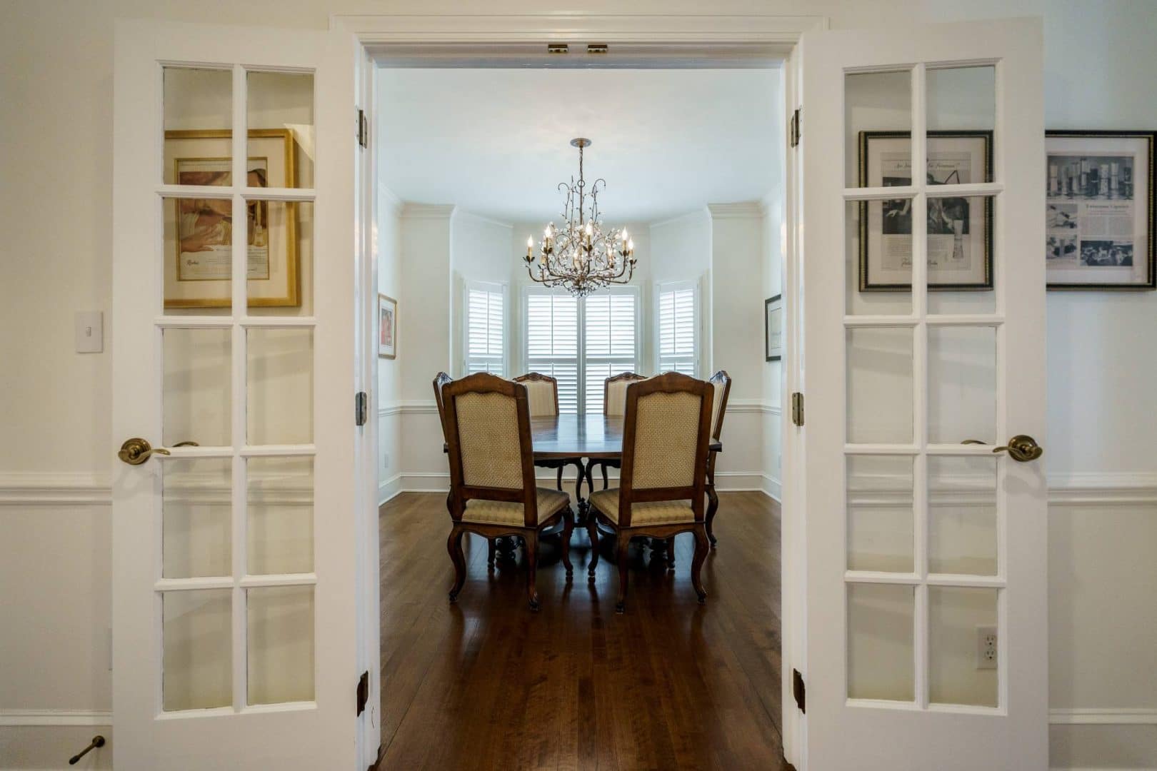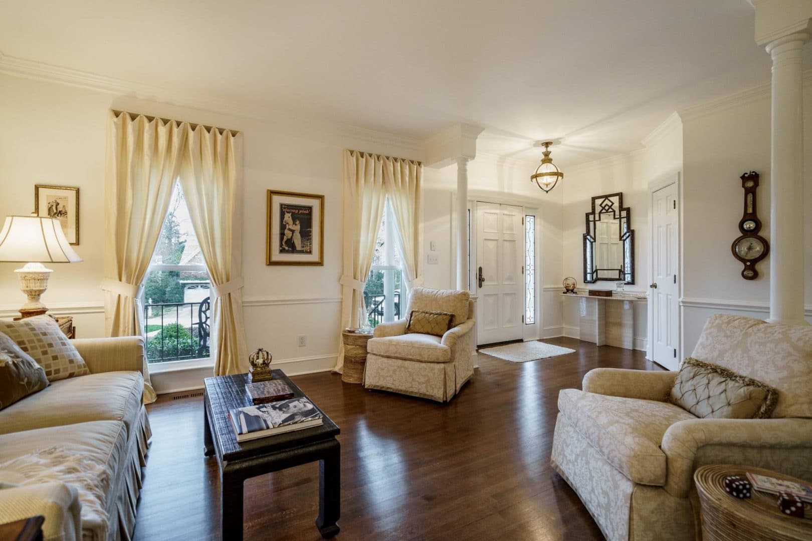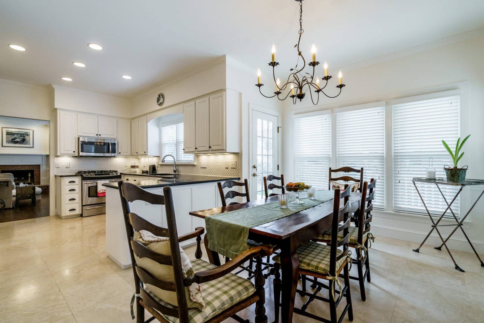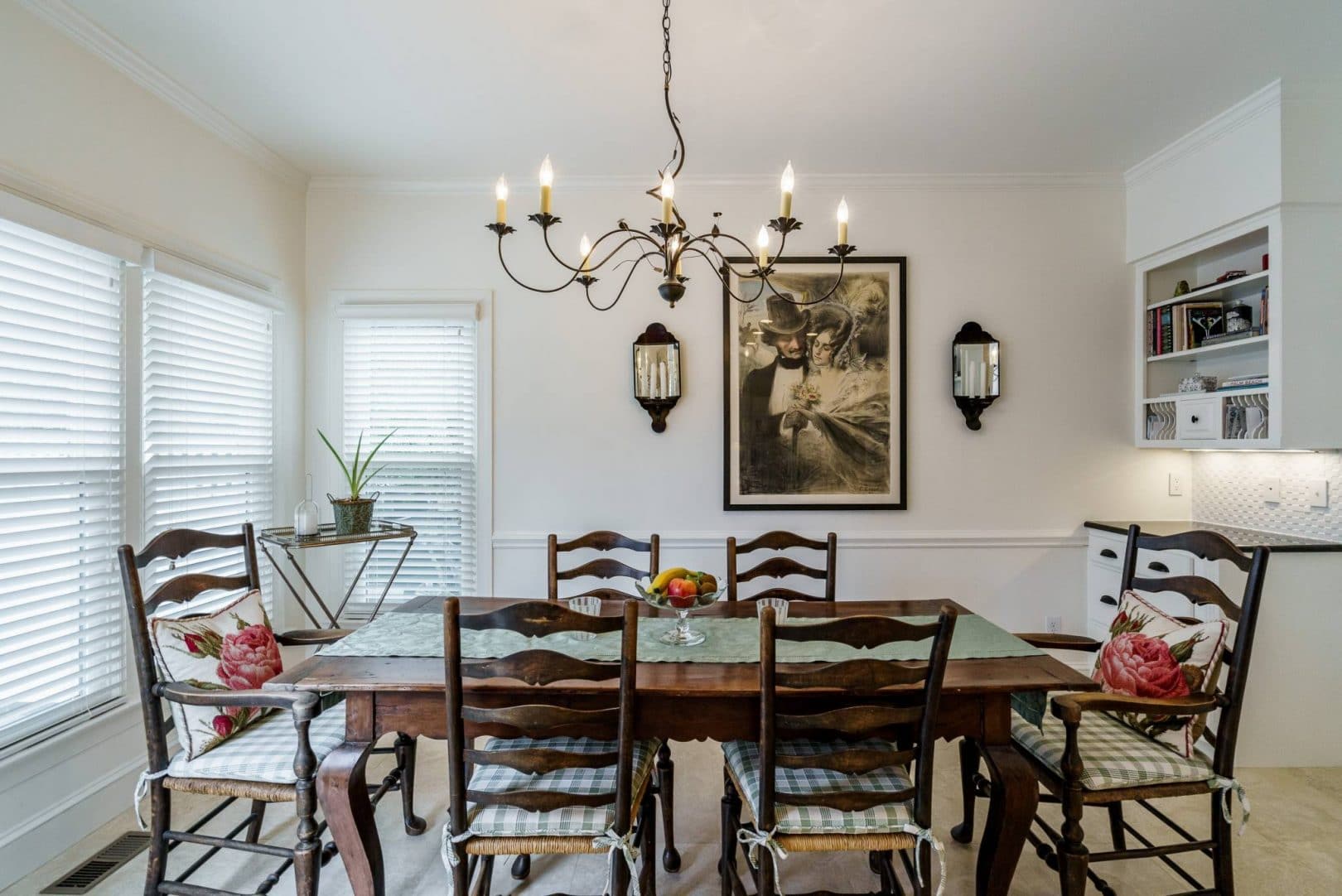 As you enter the house, you’ll notice the beautifully detailed front door, fabulous pendant light, gleaming hardwood floors, and the decorative columns that separate the open living room from the entry. Connecting to this space is a dining room that seats 10, which has a big bay window and a whimsical crystal chandelier that all will admire.