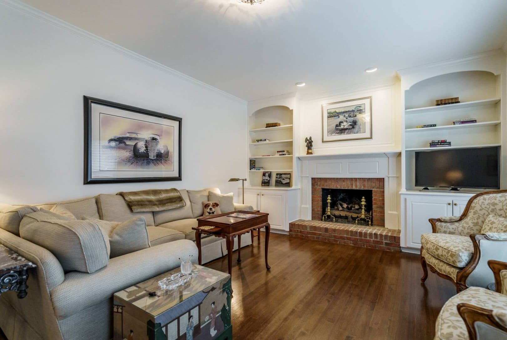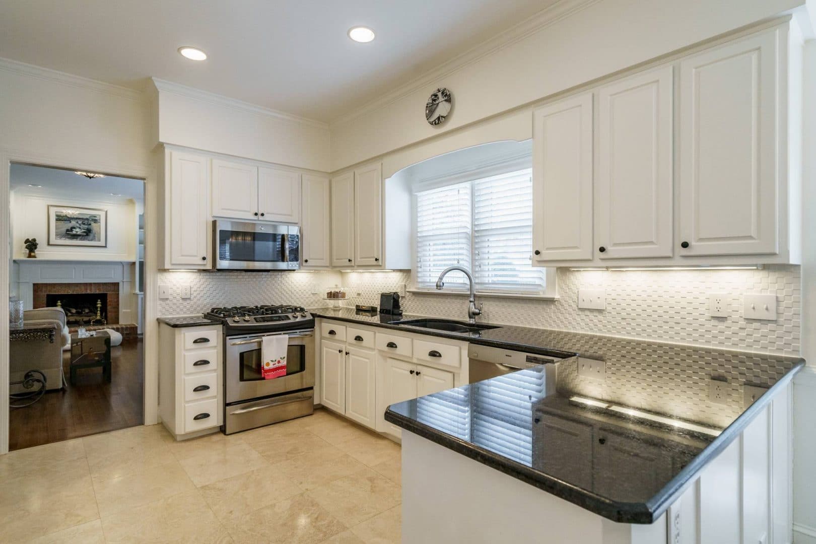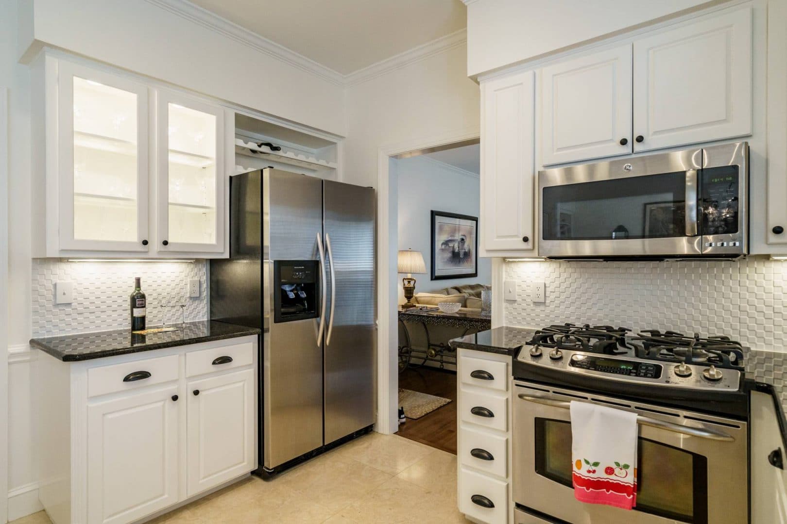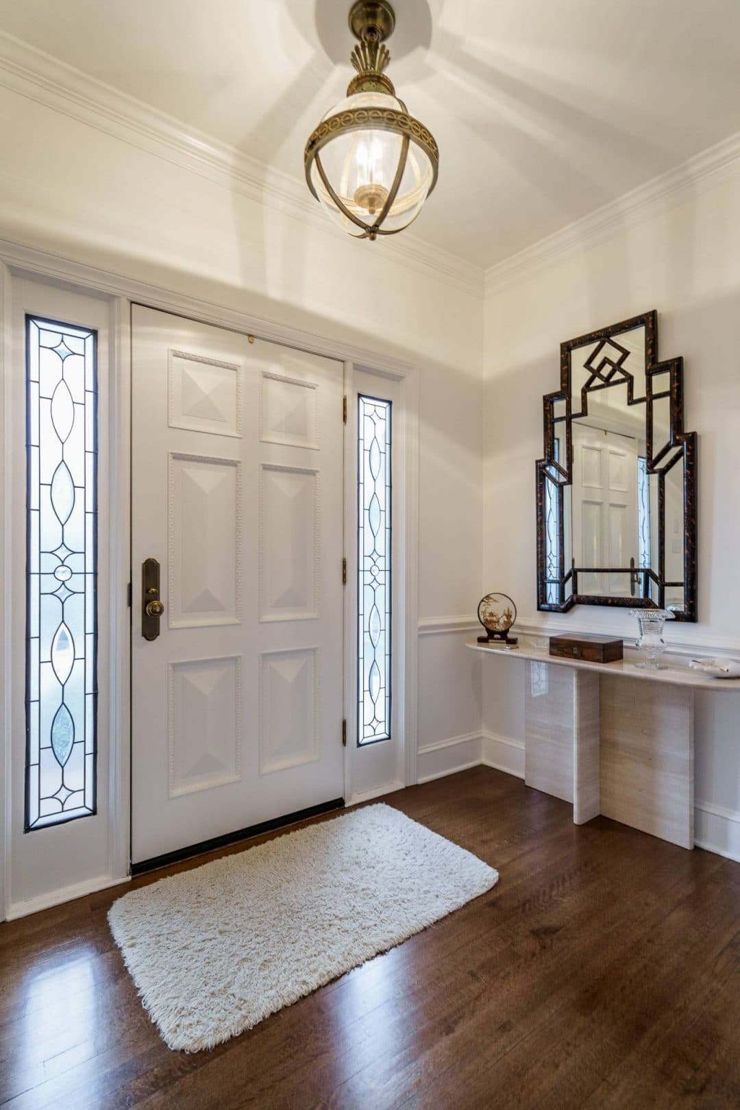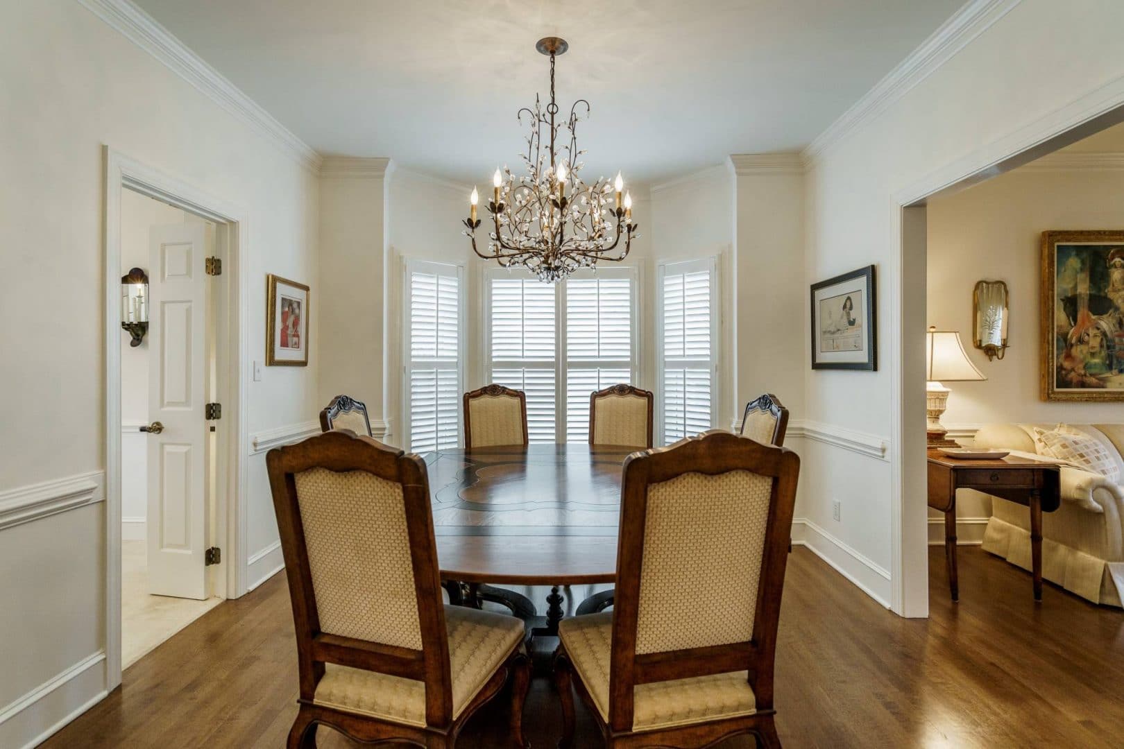 As you enter the house, you’ll notice the beautifully detailed front door, fabulous pendant light, gleaming hardwood floors, and the decorative columns that separate the open living room from the entry. Connecting to this space is a dining room that seats 10, which has a big bay window and a whimsical crystal chandelier that all will admire.