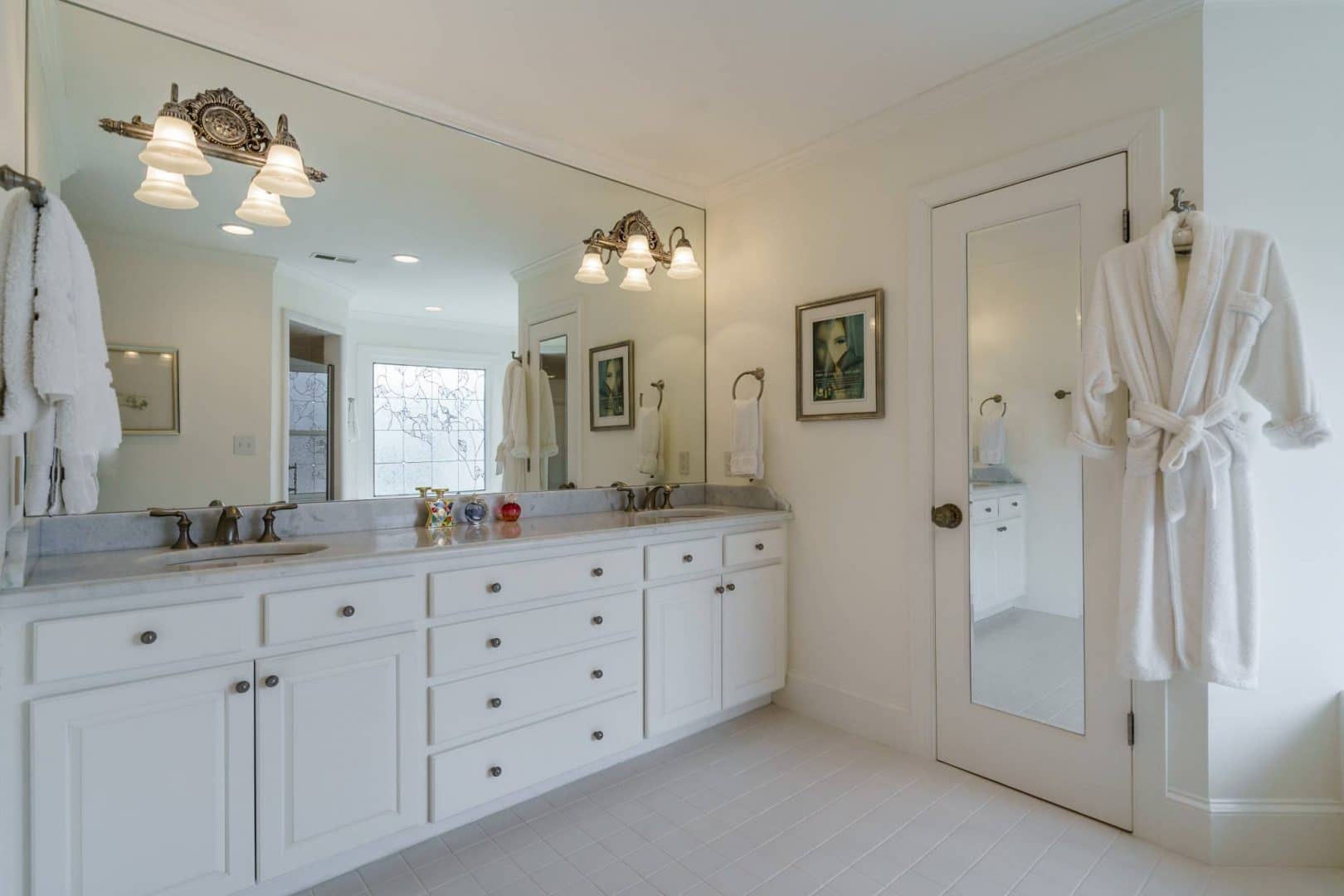 Upstairs, the private living areas reflect the same level of quality, while the master suite encompasses the entire rear of the house. Truly an owners retreat. His and Her closets are each fitted with California Closet systems. The bathroom is indulgent. Every detail has been artfully chosen, from the beautiful pale blue marble vanity, the custom glass window surrounding the corner Jacuzzi tub, to the door handles with coordinating designer hardware.