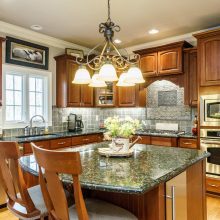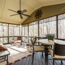 The south-facing rear of the home was designed to be open and comfortable. The large family room to the left features a gas log fireplace in the middle of beautiful built-ins. Connected to this space is a breakfast nook that provides access to the covered porch and deck. The wall of windows attracts the gorgeous outdoor views. The kitchen exudes quality – select cherry casework, stainless appliances including an ice machine, stone backsplash, and acres of granite prep space. The large laundry room is down the hall and includes a sink and casework. The garage entry and back stairs converge at a nice mudroom with a built-in boot bench.