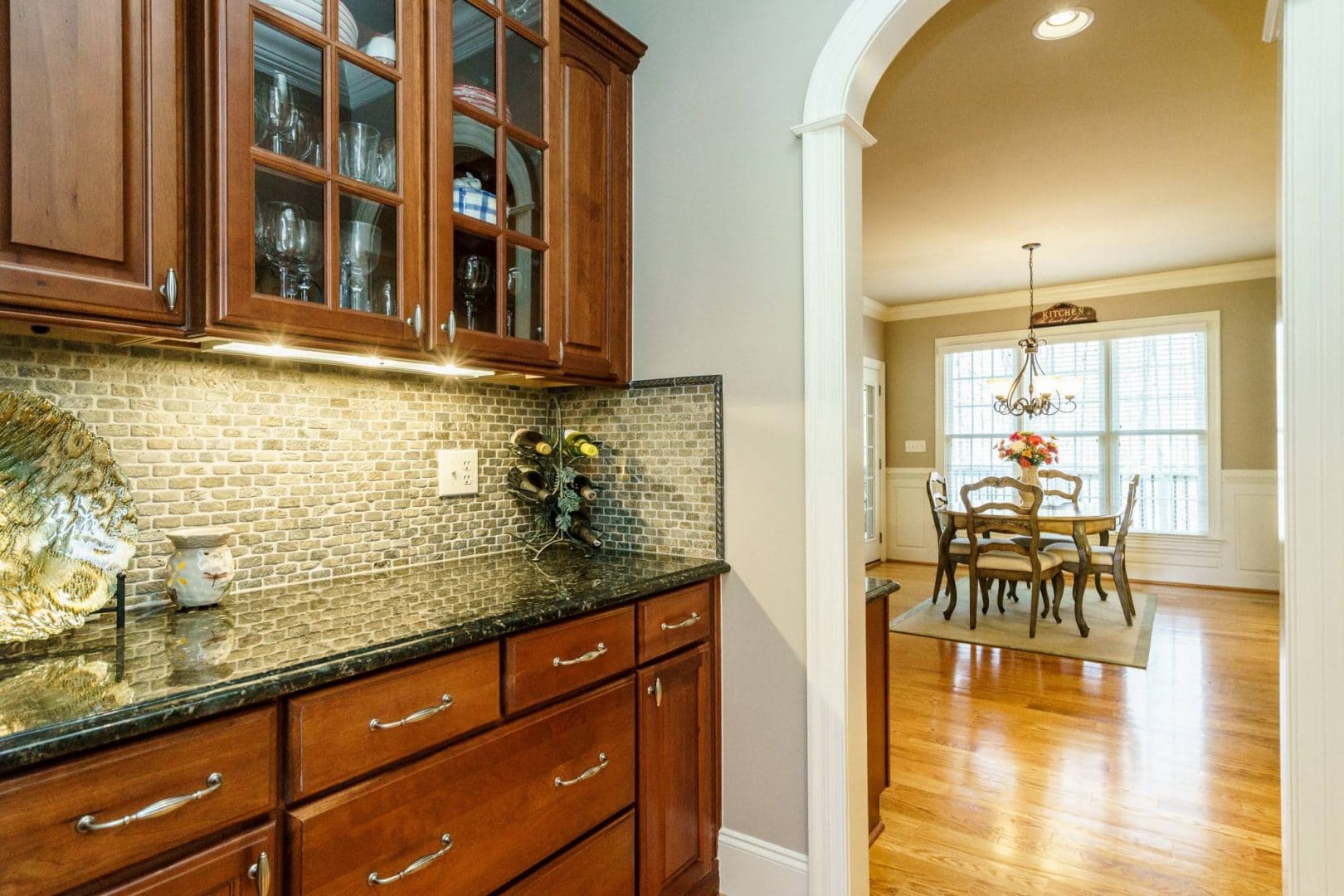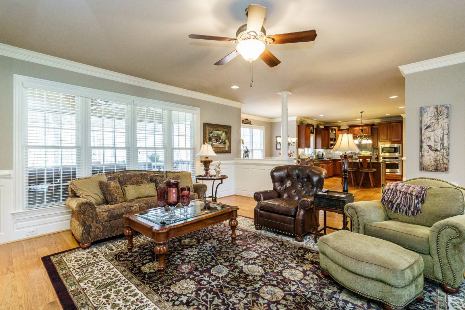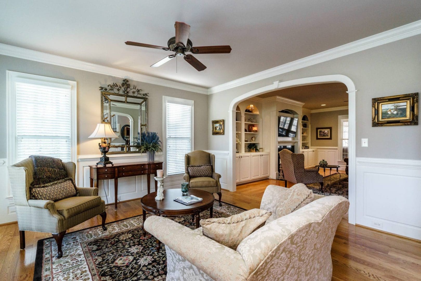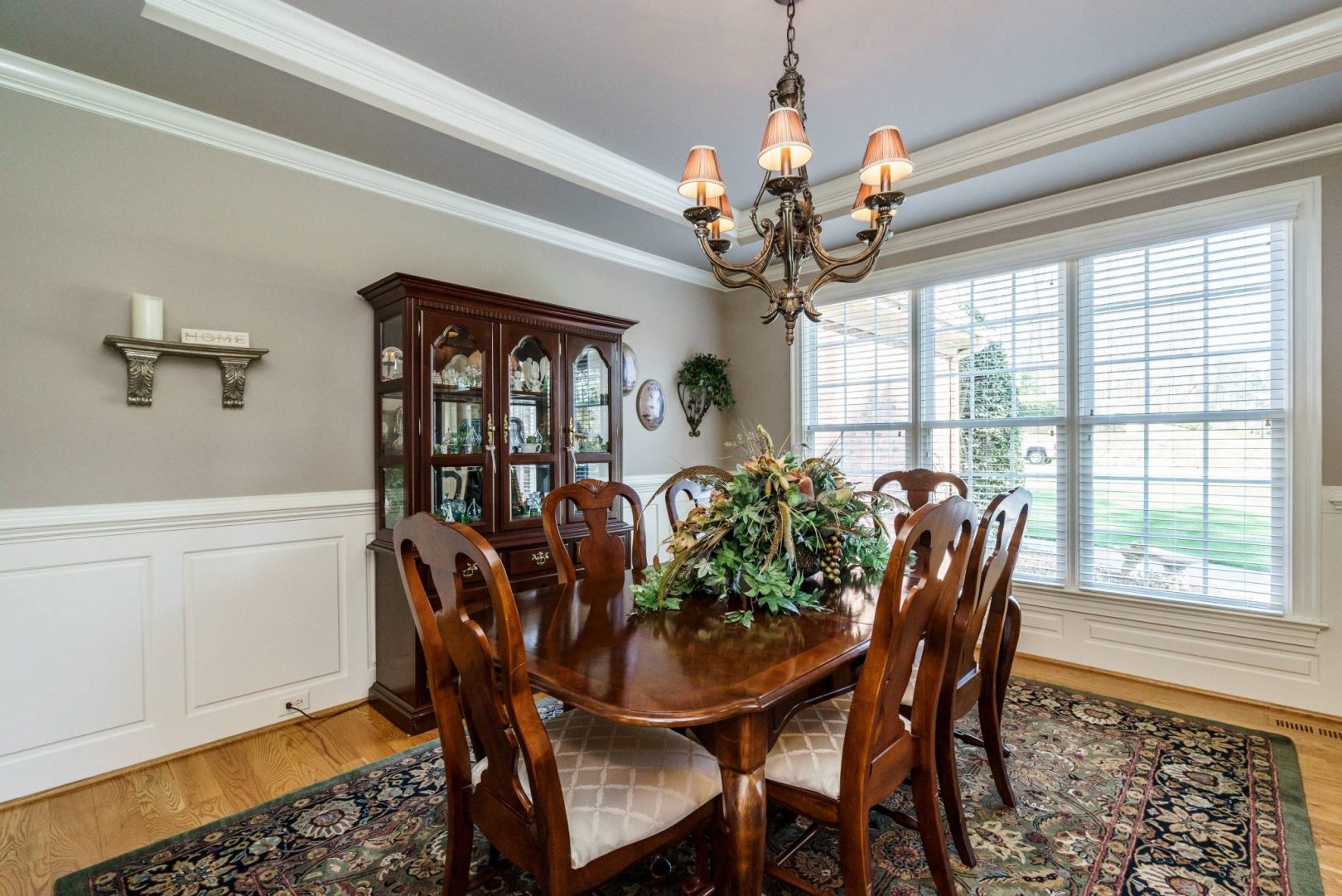 Currently being offered for sale is a brick estate on the edge of Falls Lake. 1029 Harpers Ridge Court is a flawless custom home that typifies the Falls Lake lifestyle. A sweeping lawn leads your guests to the covered entry – the manicured landscape highlights the stately curb appeal. It is apparent from the first step into the soaring foyer that his home was built with a craftsman’s careful touch. Custom millwork wraps every edge and the gleaming wide-plank hardwoods seem to go on forever. The formal rooms flank the foyer and feature arched openings and milled wainscoting.
