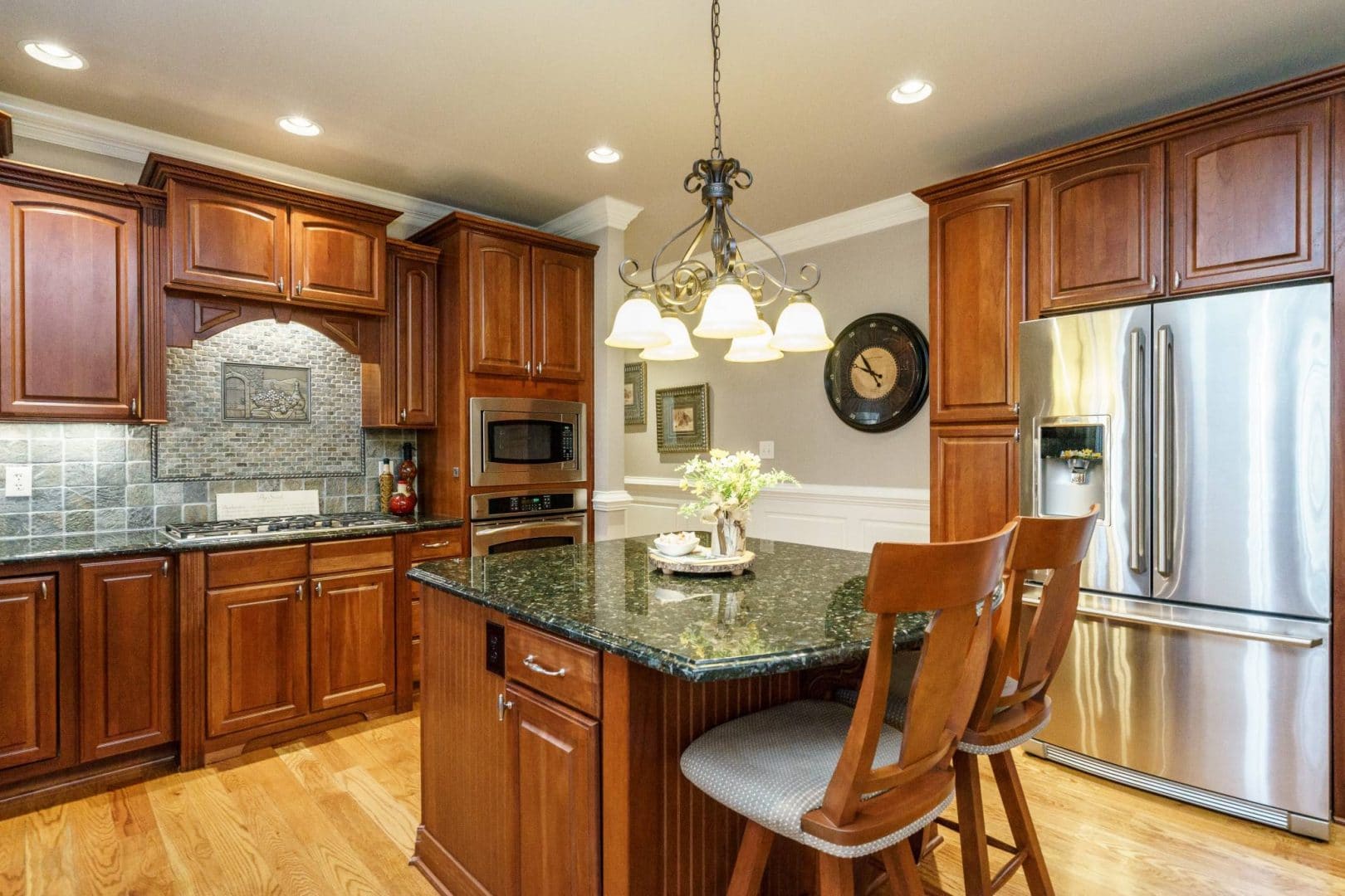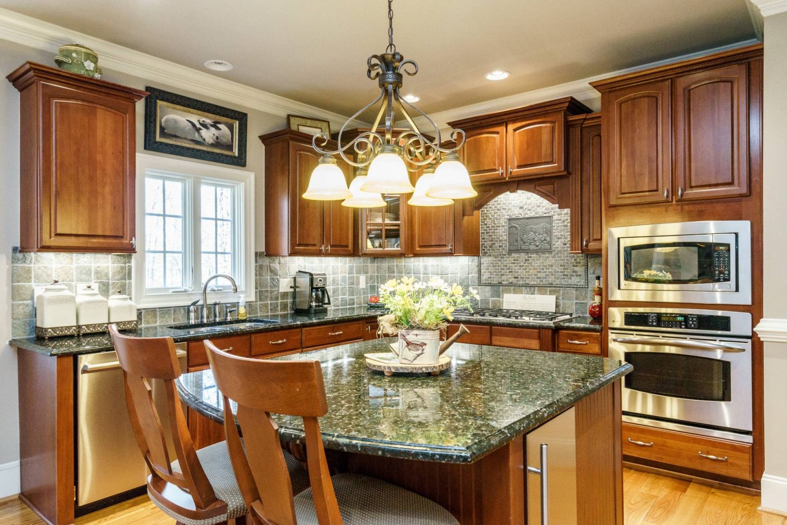 The south-facing rear of the home was designed to be open and comfortable. The large family room to the left features a gas log fireplace in the middle of beautiful built-ins. Connected to this space is a breakfast nook that provides access to the covered porch and deck. The wall of windows attracts the gorgeous outdoor views. The kitchen exudes quality – select cherry casework, stainless appliances including an ice machine, stone backsplash, and acres of granite prep space. The large laundry room is down the hall and includes a sink and casework. The garage entry and back stairs converge at a nice mudroom with a built-in boot bench.