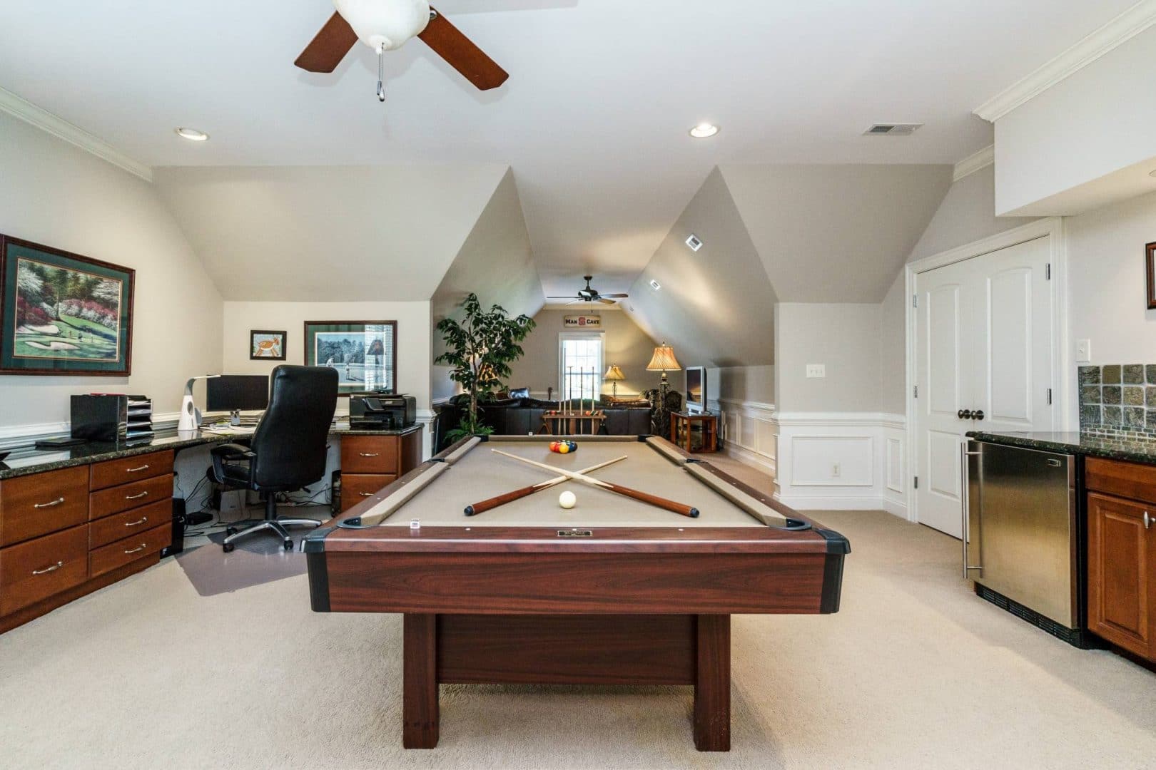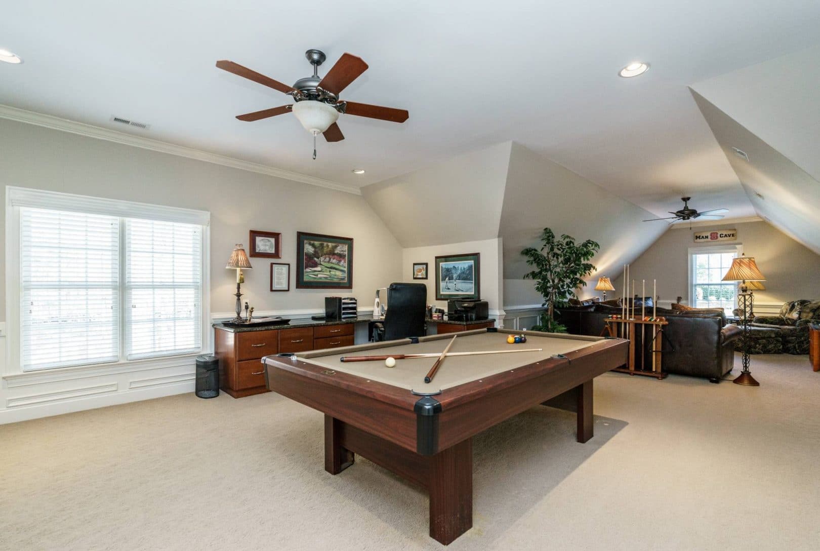 Upstairs, the private space are equally as detailed. The master suite encompasses the entire east side. The bedroom is very generous and has a huge closet. The master bath has double sinks, a glassed shower and corner jetted tub that looks out to the woods beyond. This space is truly an owners retreat. There are two bedrooms to the left that share a jack-n-jill bathroom and a very large bedroom suite to the right. Each of these rooms has great closet space and ceiling fans. The bonus room at the end of the hall offers a comfortable private living opportunity. Separated into two “rooms”, the use options are numerous. There is a built-in desk with granite top as well as a wet bar.