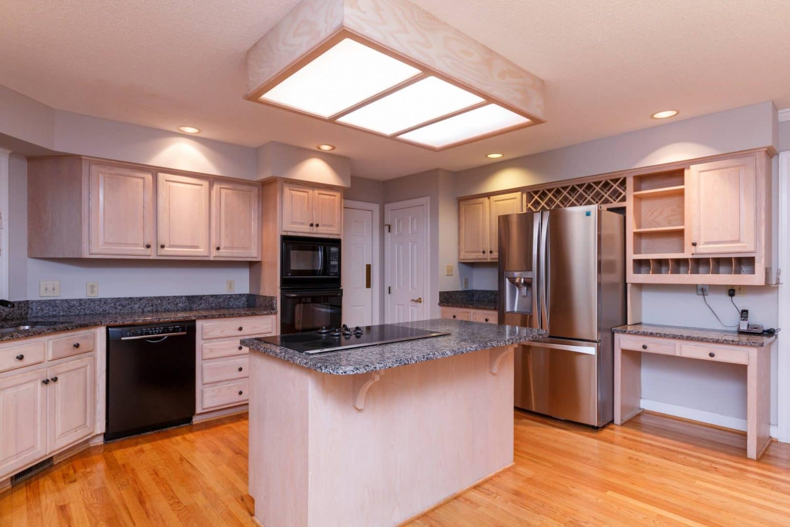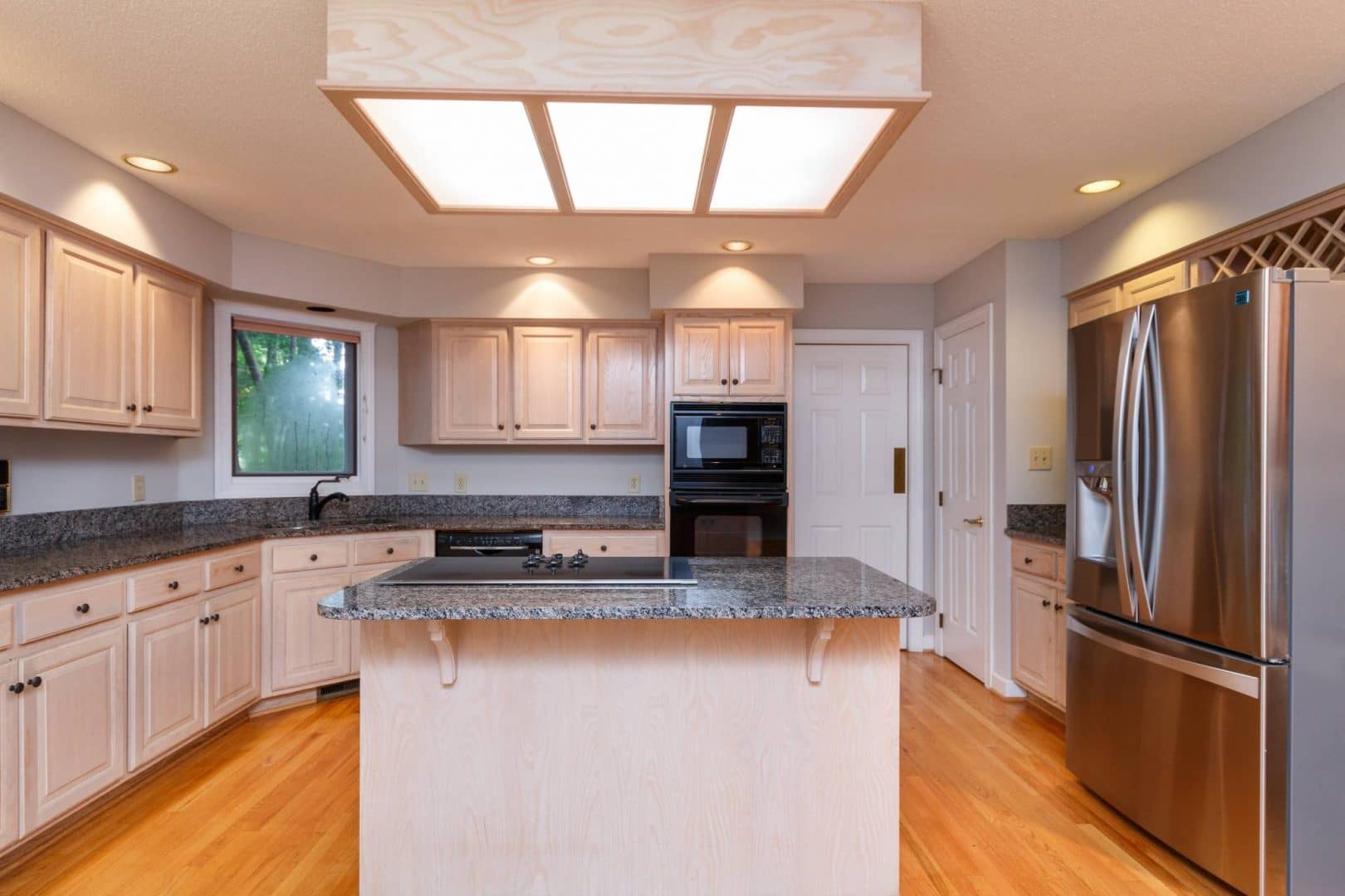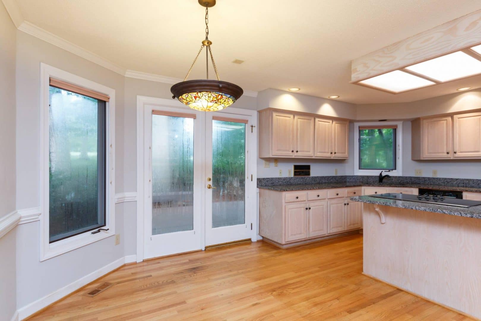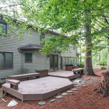 The rear of the home features an open living concept with the kitchen and breakfast nook flowing into a family room. This comfortable space invites the outside in, with a wall of large windows and a stone fireplace flanked with custom built-ins. The large kitchen is set up for entertaining with a walk-in pantry, more than enough creamy casework, a glass cook top in the center island, and acres of granite prep space. The breakfast nook features full-light French doors leading out to the expansive three-level deck, which allows the party to flow in and out. And of course, the privacy of the bubbling hot tub might be all you need to forget about the cares of the week…